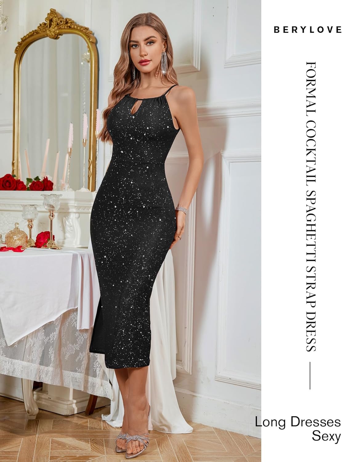 BeryLove Sequin Homecoming Cocktail Formal Spaghetti Strap Dresses Wedding Guest Glitter Sparkly Party Prom Dress