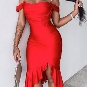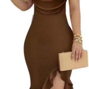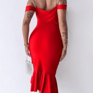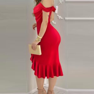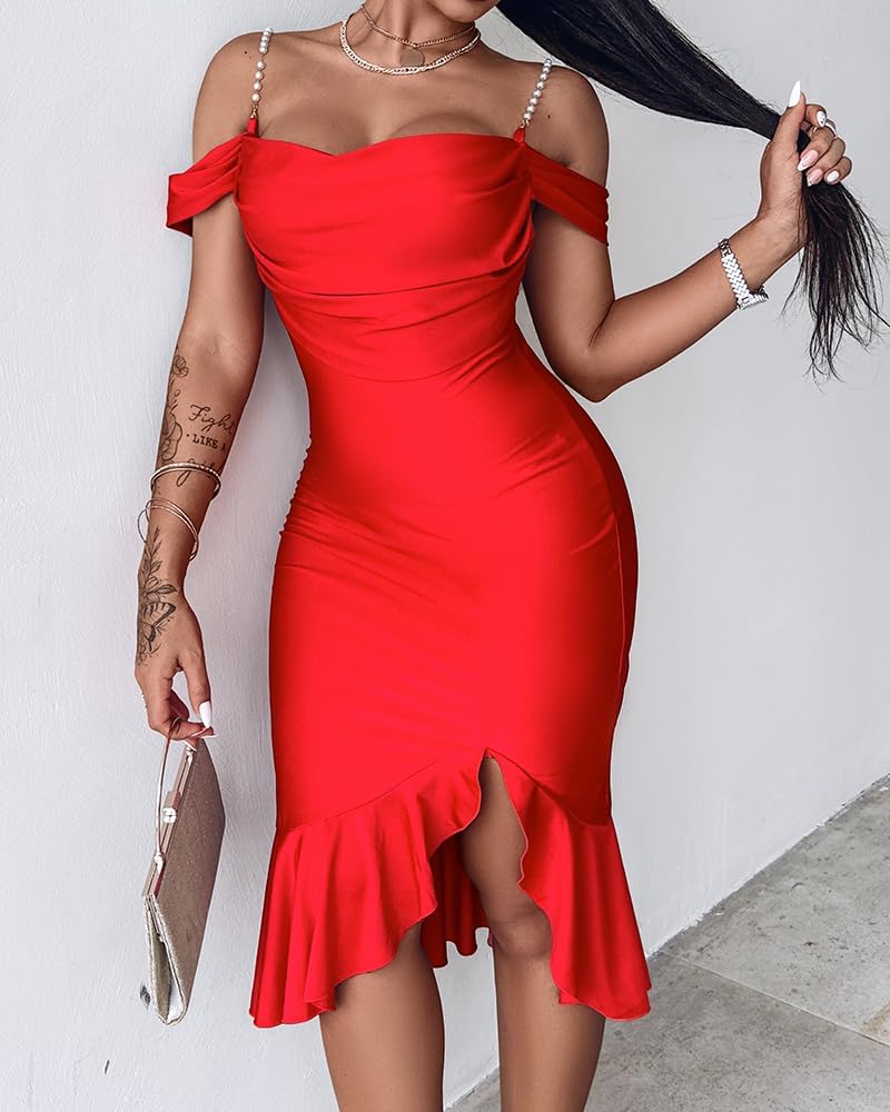 CHICME Womens Sexy Bodycon Party Dress Off The Shoulder Pearls Strap Midi Dress Ruffle Hem Cocktail Dresses