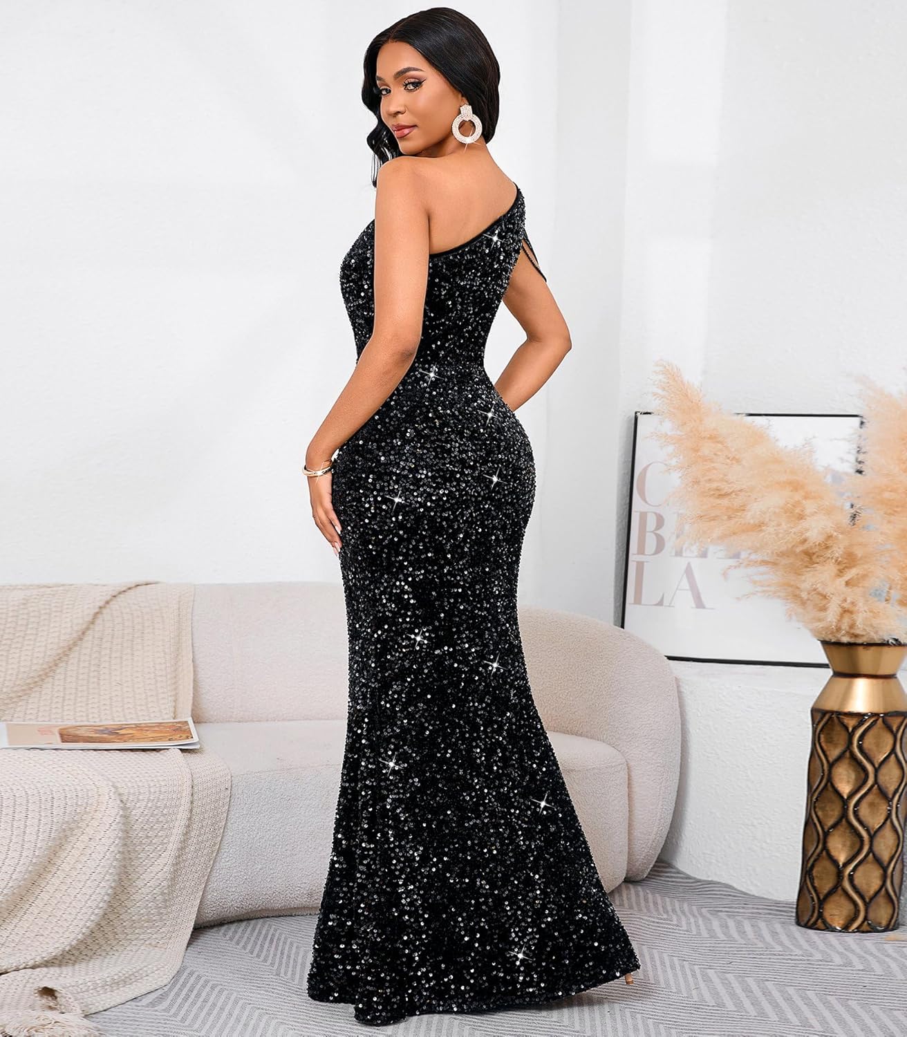 Cololura Women Sequin Elegant Sexy One Shoulder Tassel Mermaid Bodycon Cocktail Evening Dress