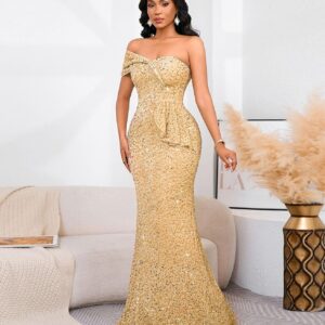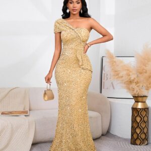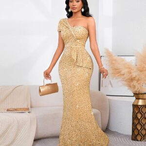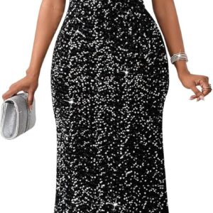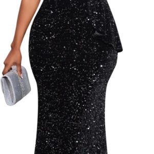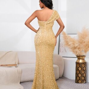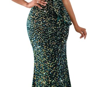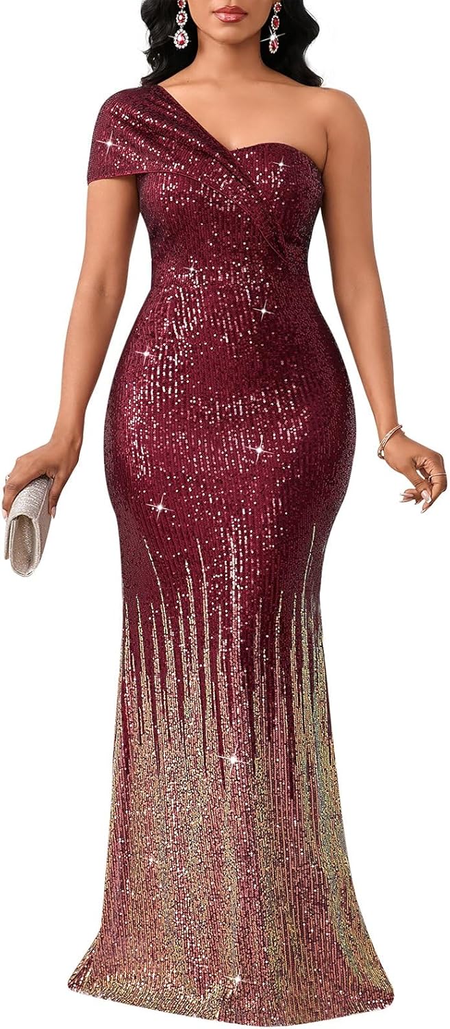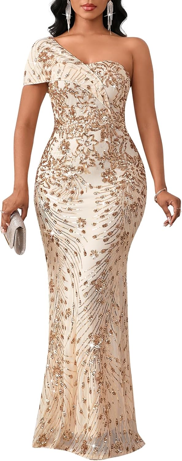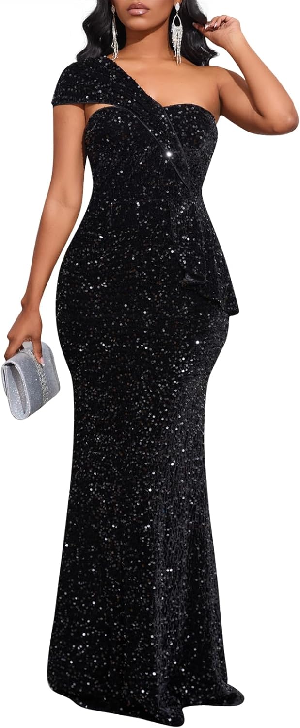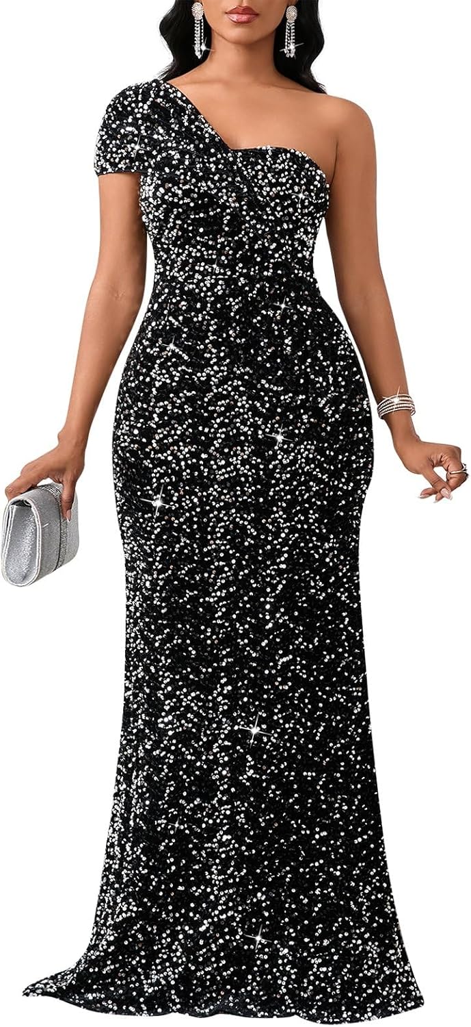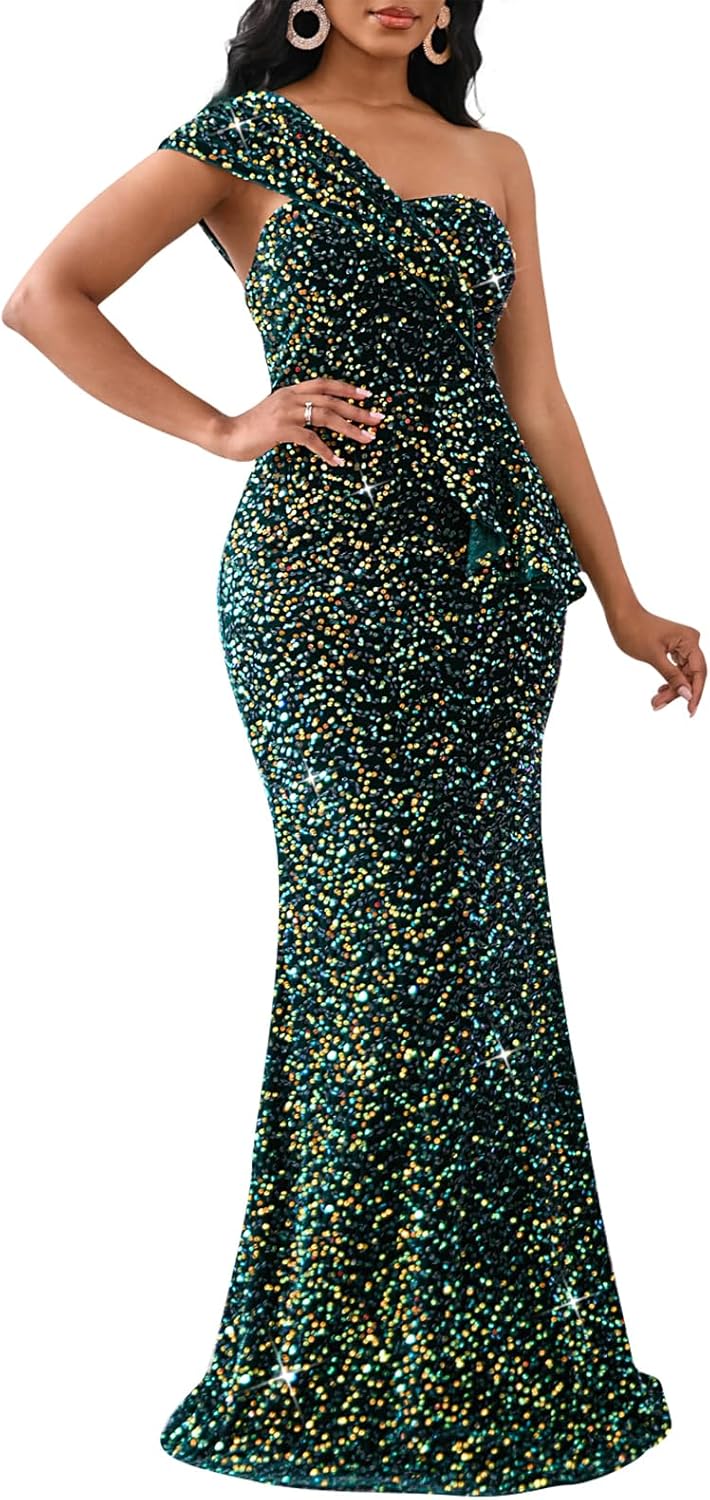 Cololura Women Sexy Sequin One Shoulder Mermaid Formal Party Cocktail Gowns Bodycon Evening Maxi Dress