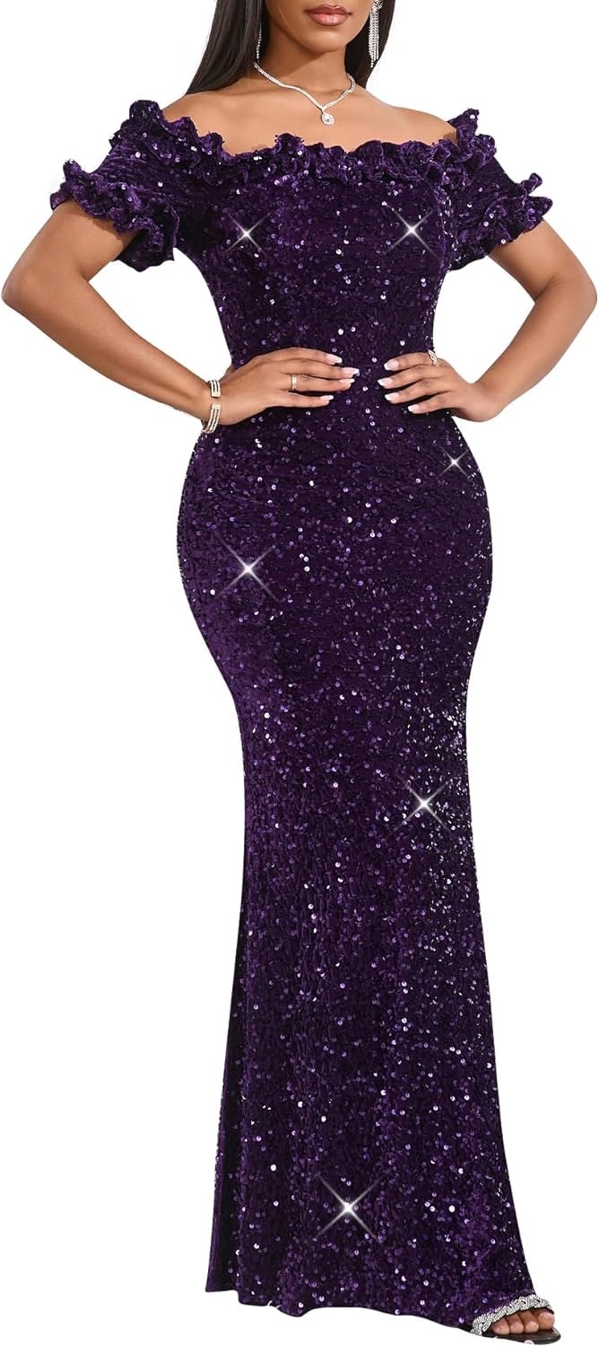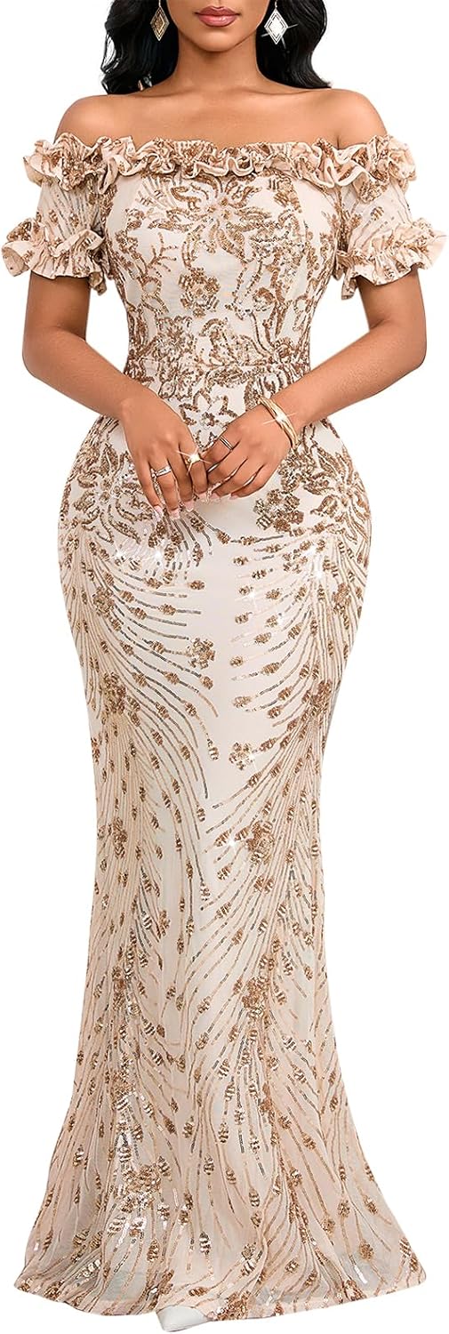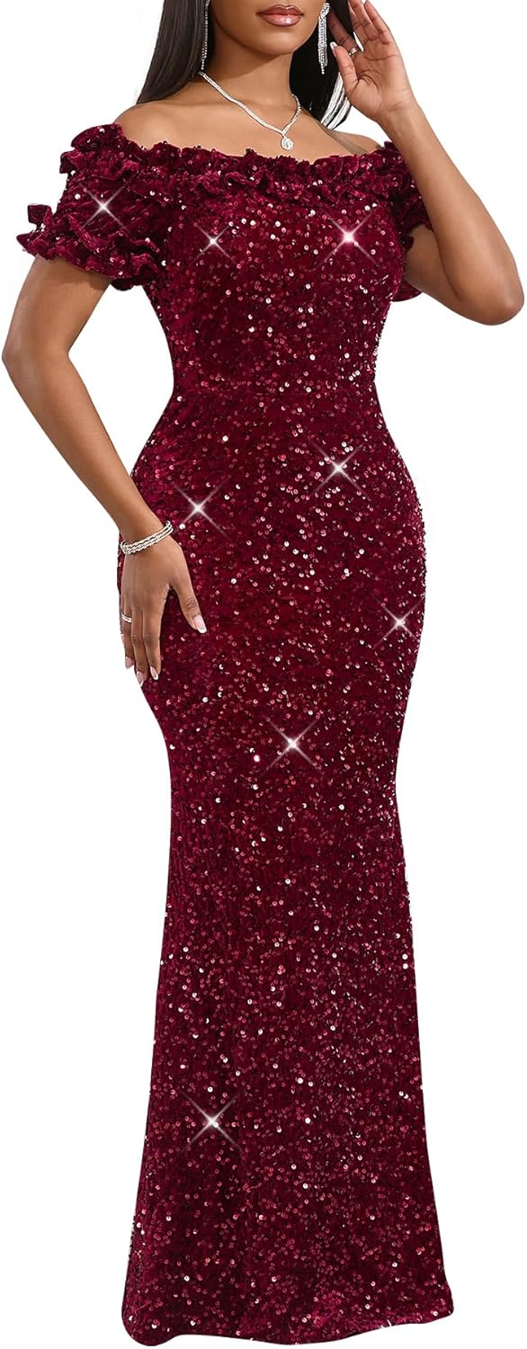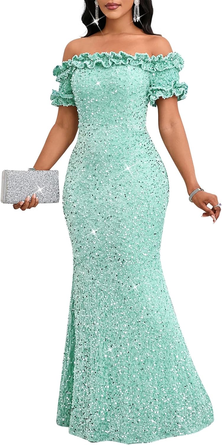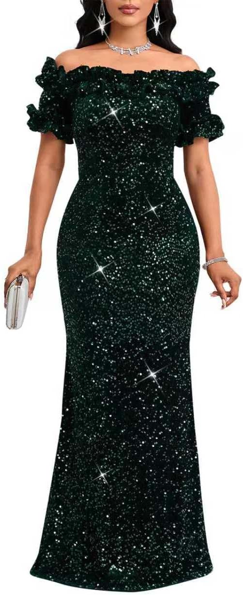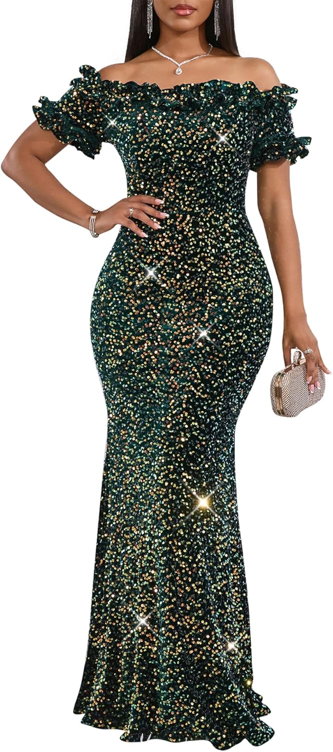 dasmzper Women Sexy Sequin Off Shoulder Ruffle Short Sleeve Bodycon Mermaid Party Formal Evening Maxi Dress