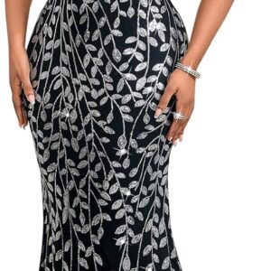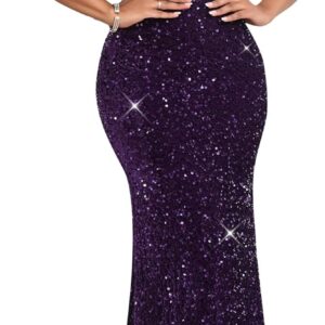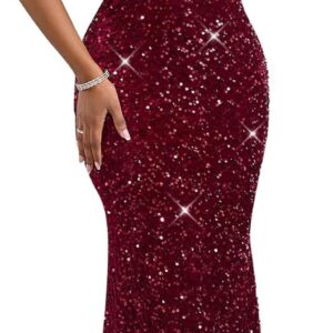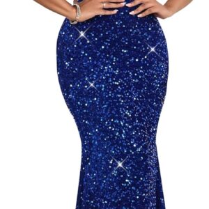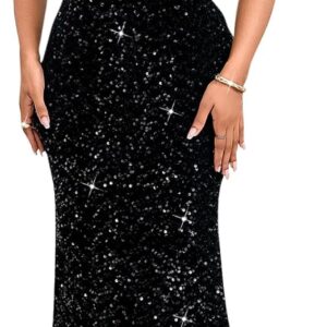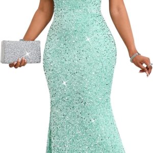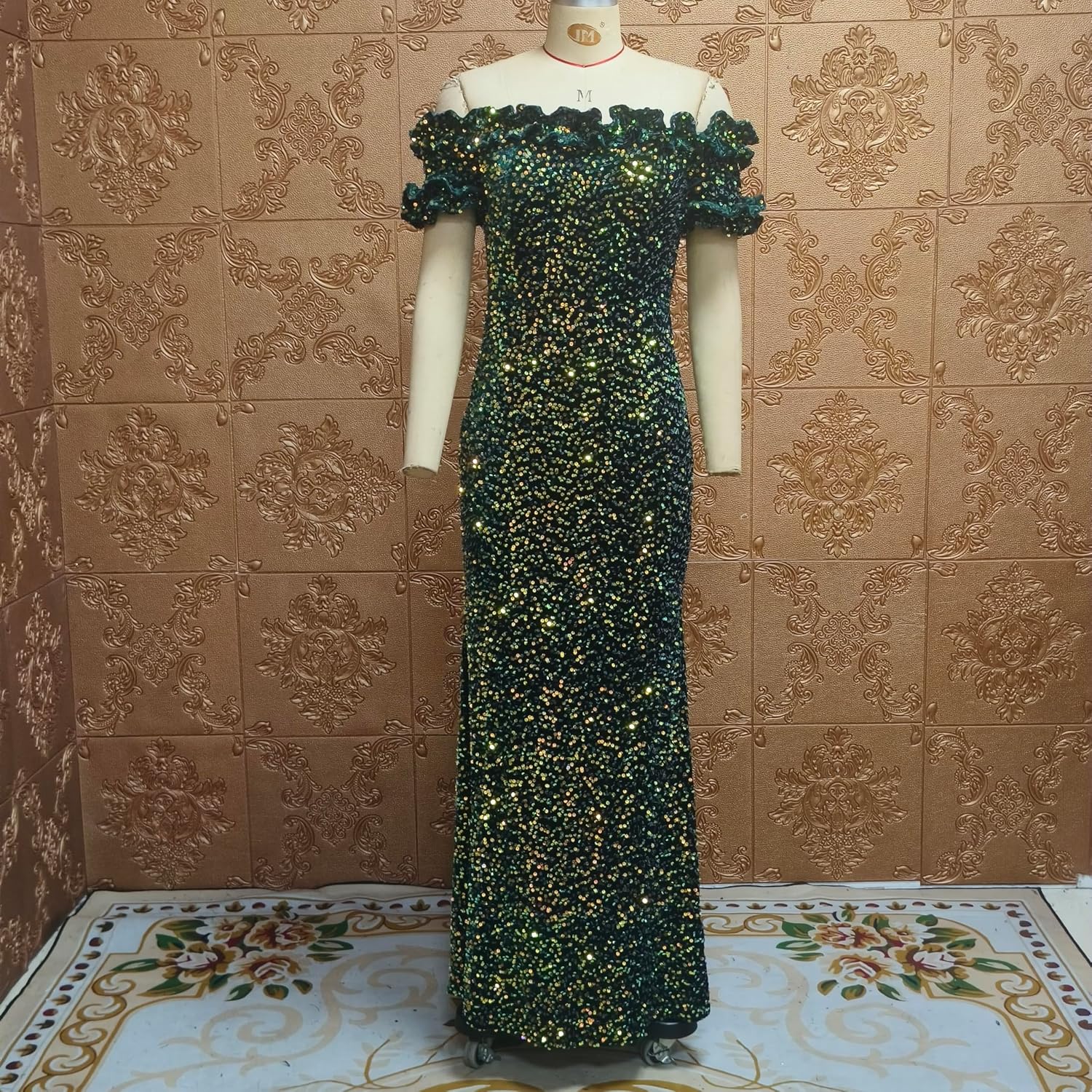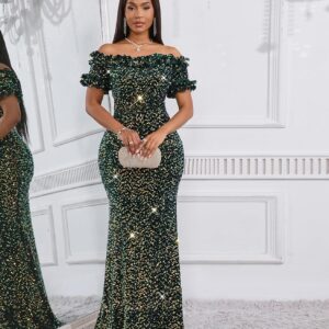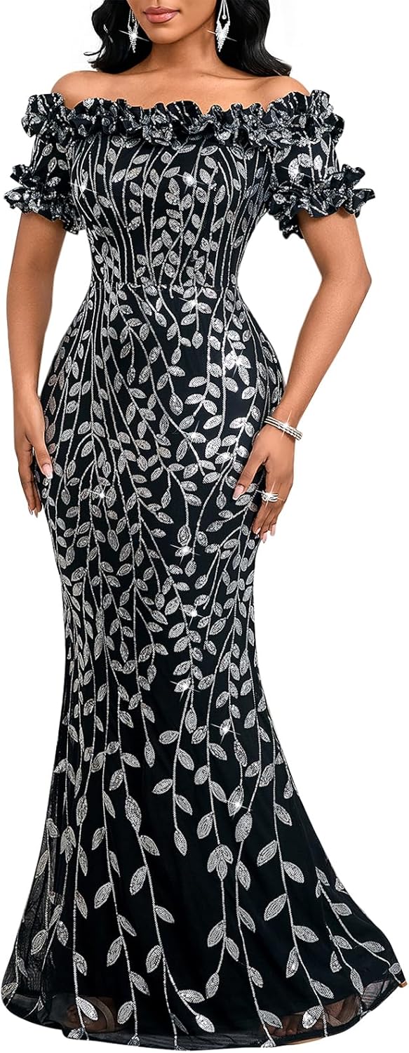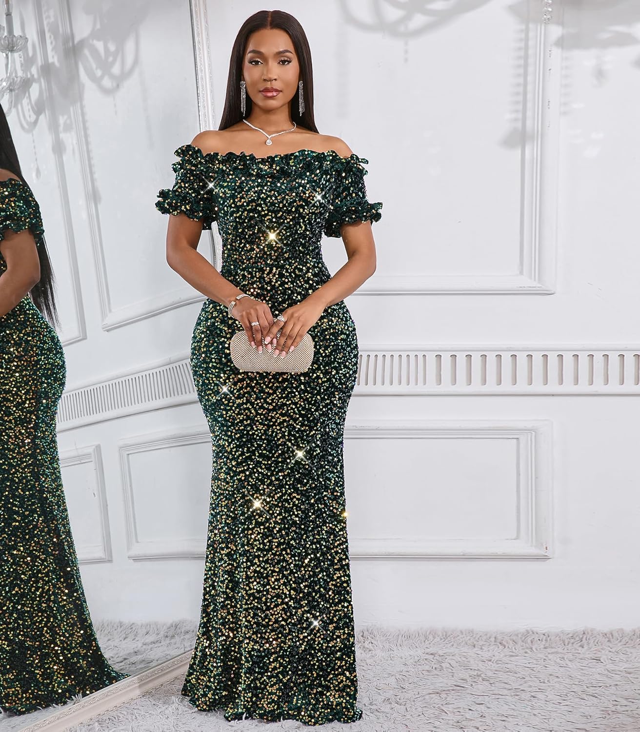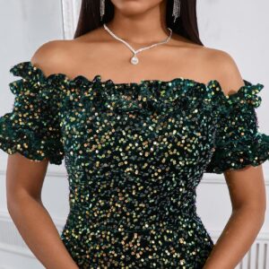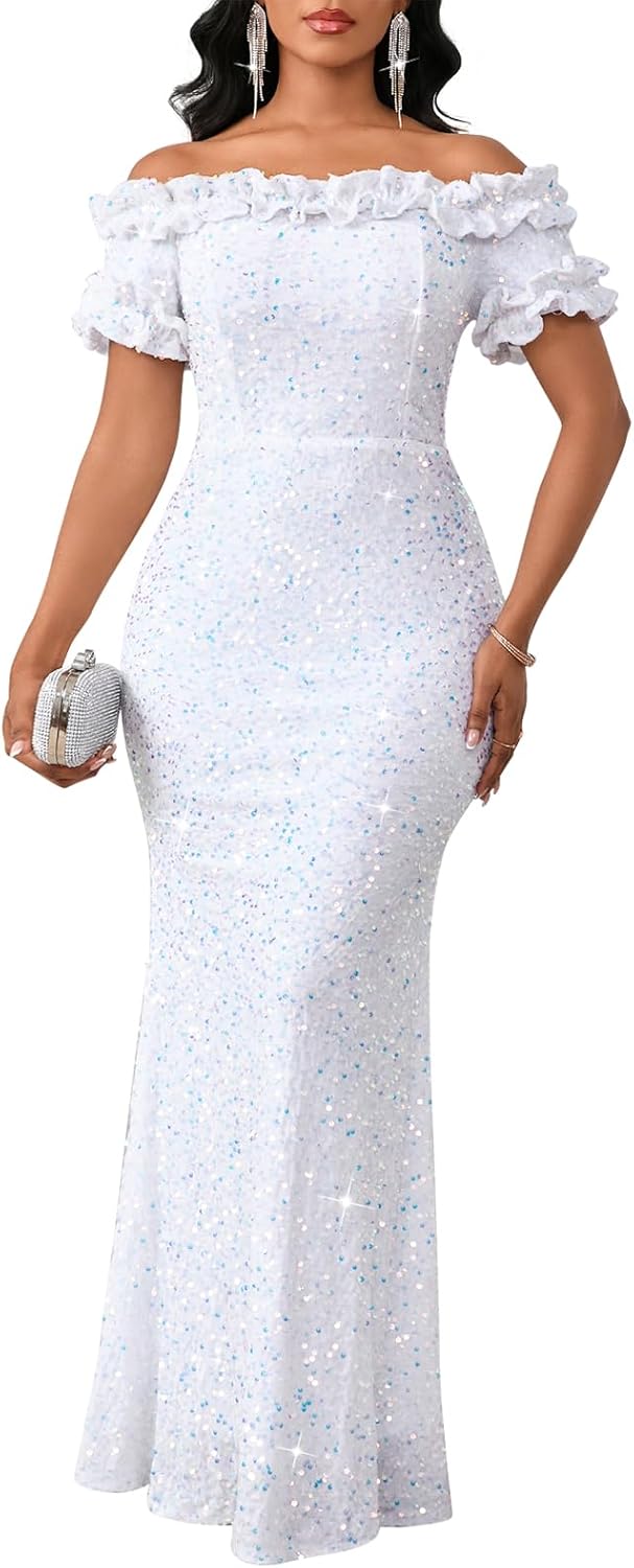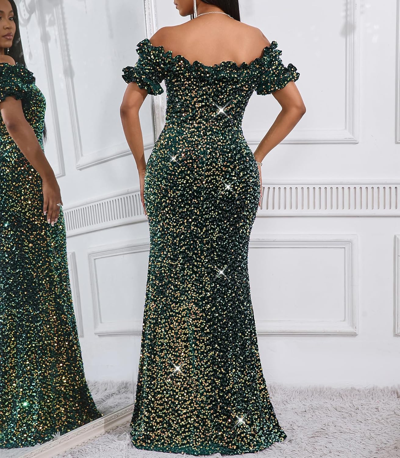 dasmzper Women Sexy Sequin Off Shoulder Ruffle Short Sleeve Bodycon Mermaid Party Formal Evening Maxi Dress
