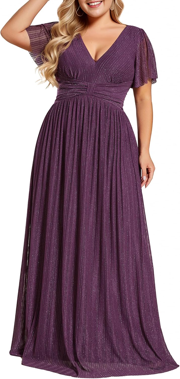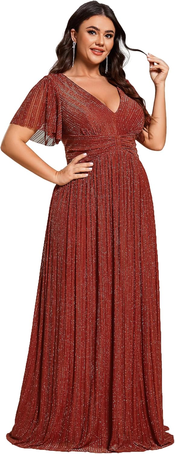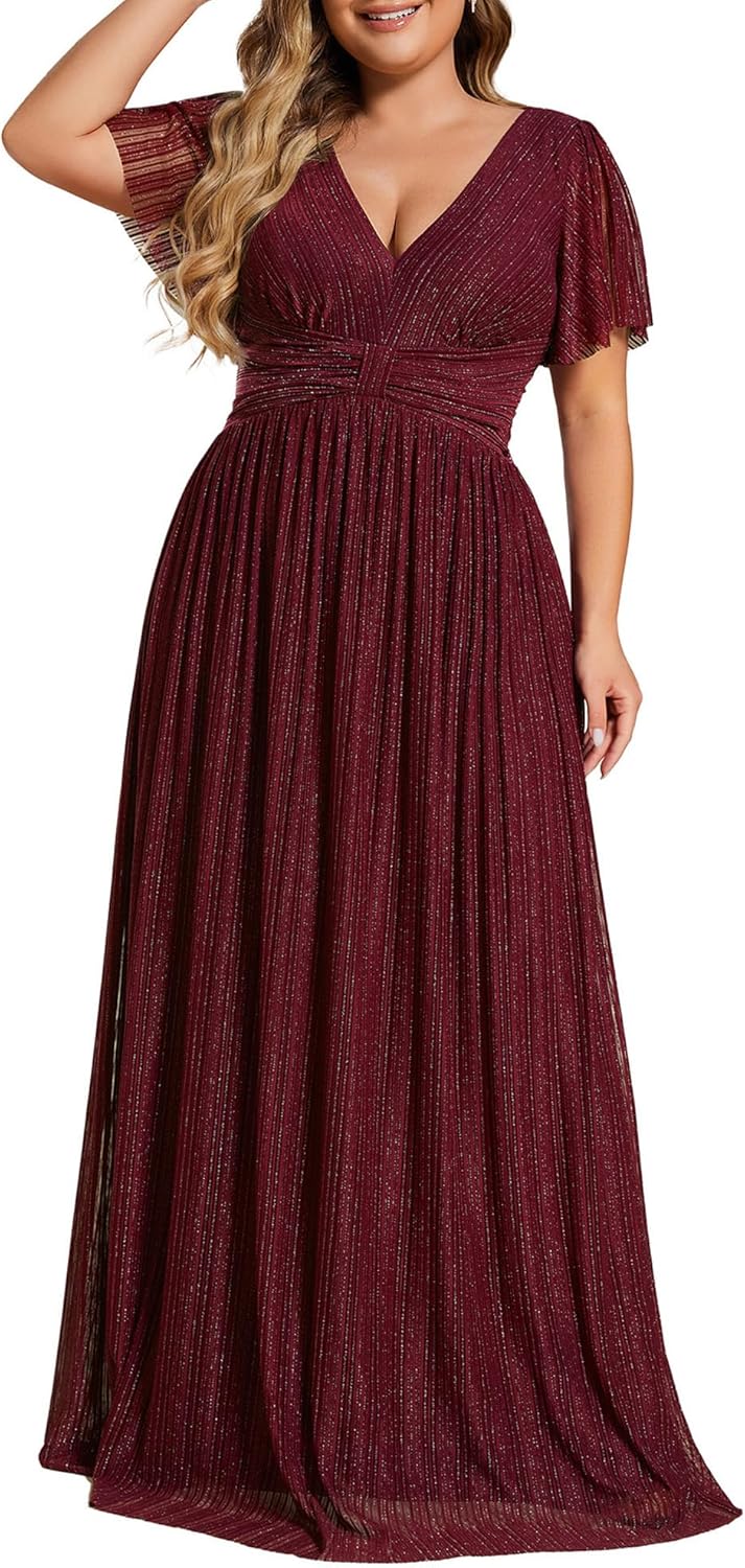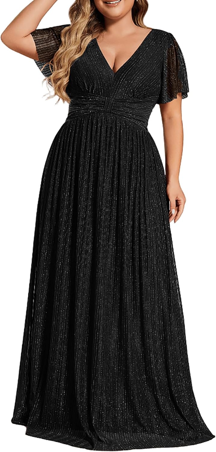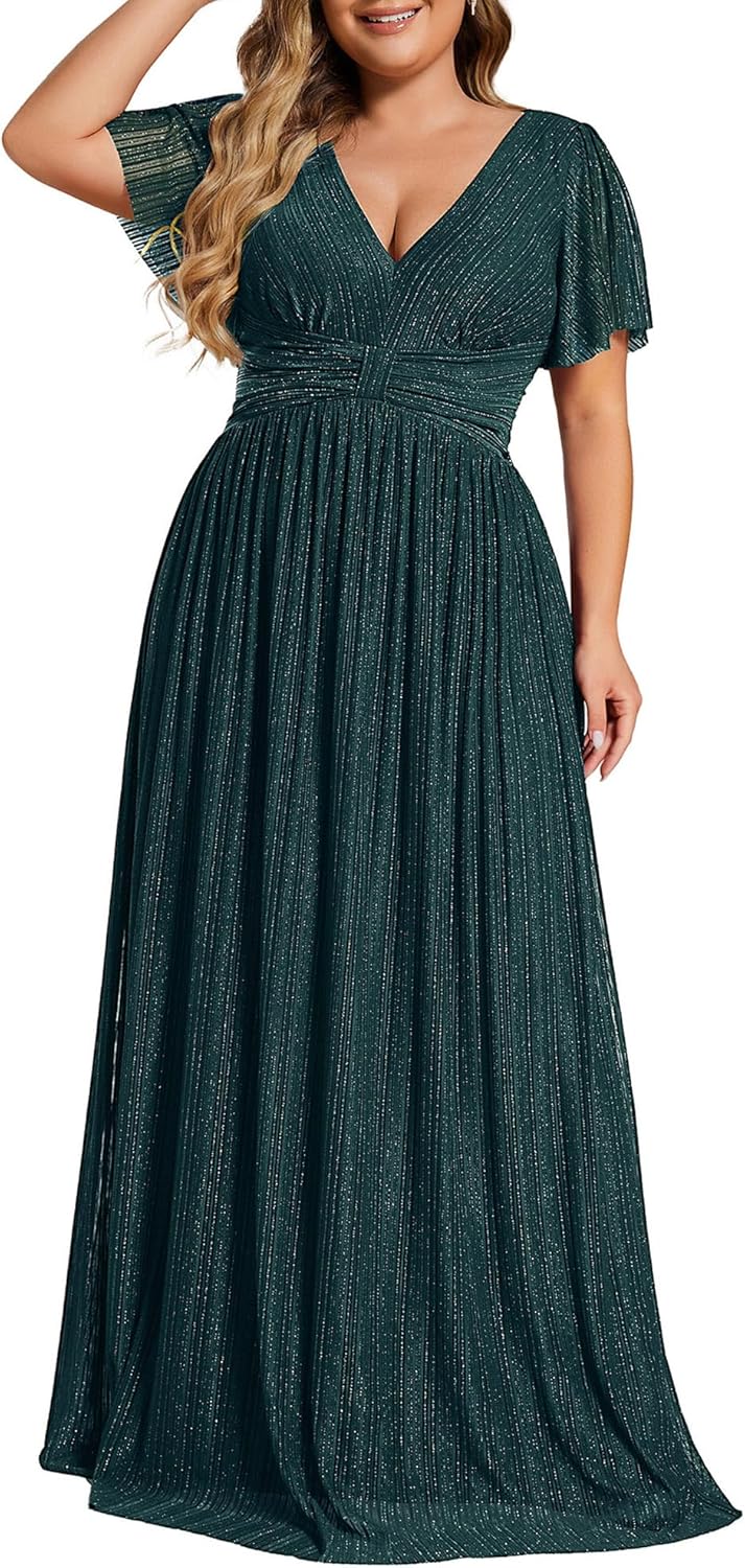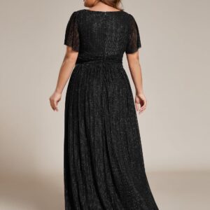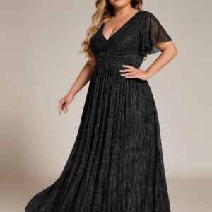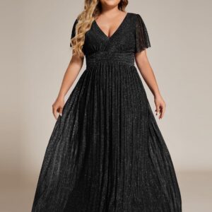 Ever-Pretty Women’s A Line V Neck Glitter Short Sleeves Pleated Plus Size Formal Evening Dresses 11961-DA
