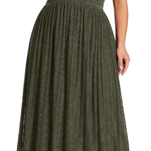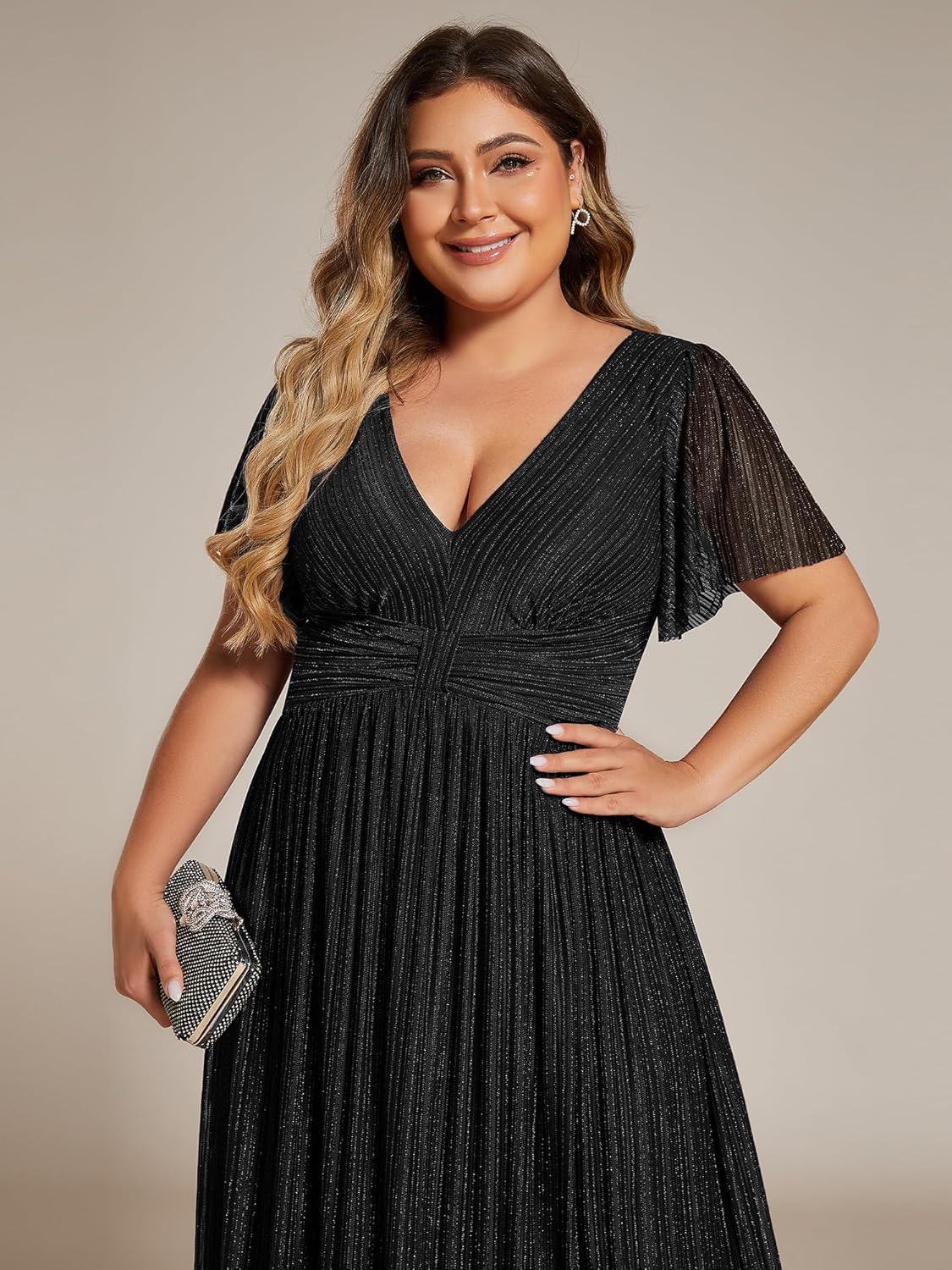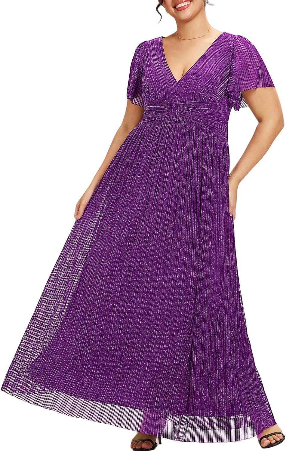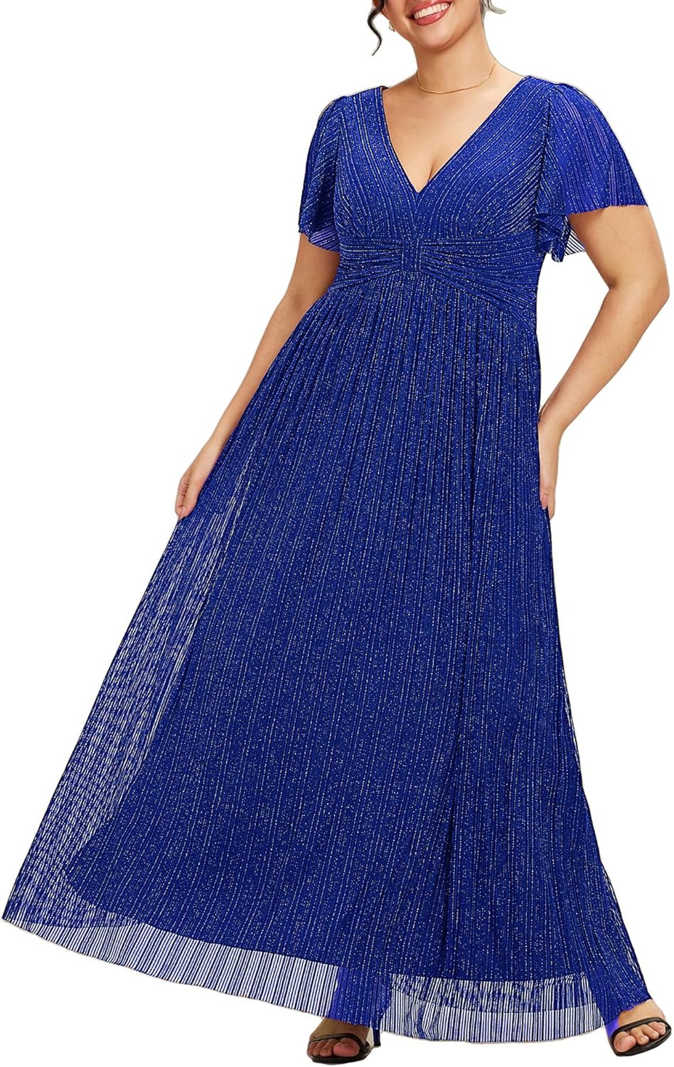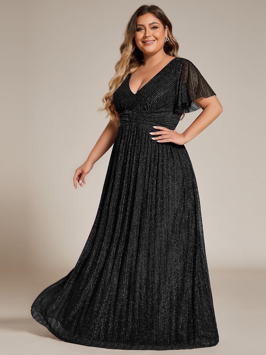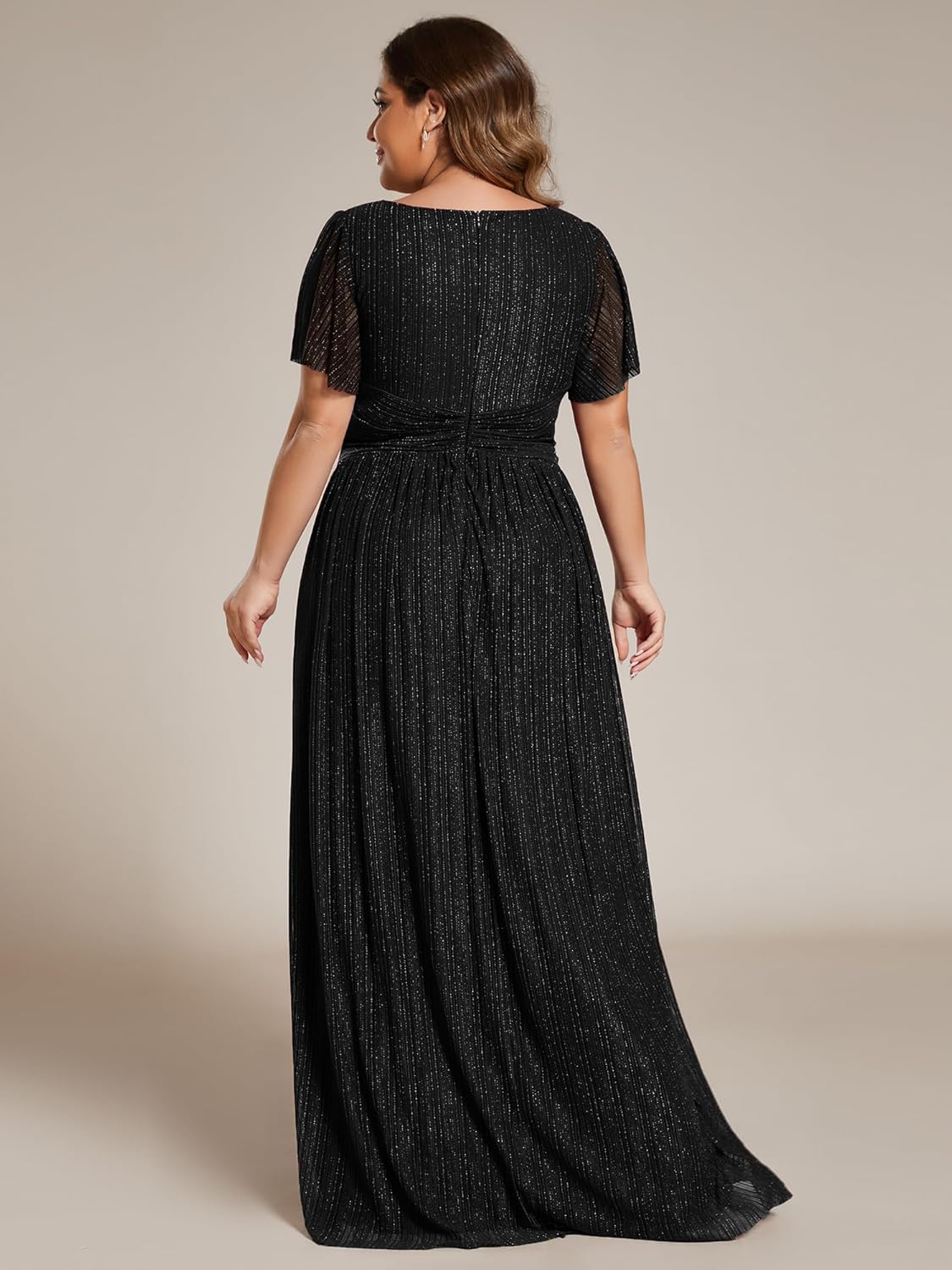 Ever-Pretty Women’s A Line V Neck Glitter Short Sleeves Pleated Plus Size Formal Evening Dresses 11961-DA