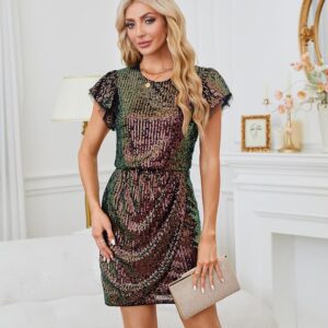 Crew Neck Ruffle Sleeve Mini Sequin Dress Cocktail Party Glitter Dresses
