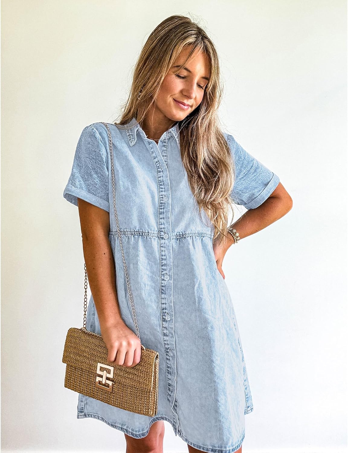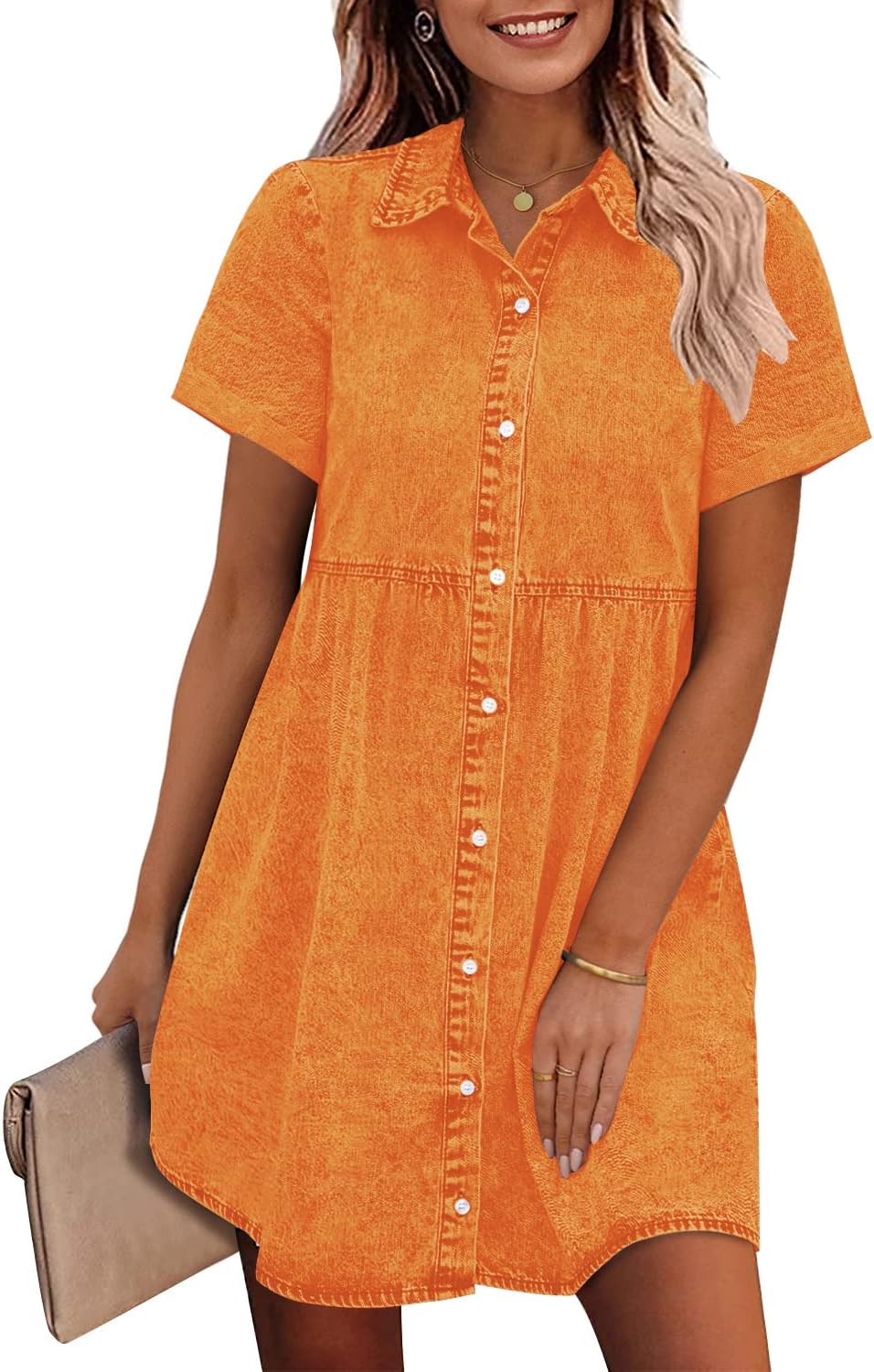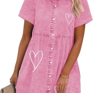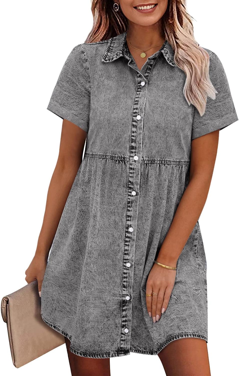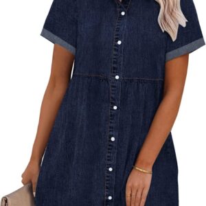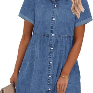 GRAPENT Denim Dress for Women Babydoll Tiered Short Sleeve Button Down Jean Shirt Dresses