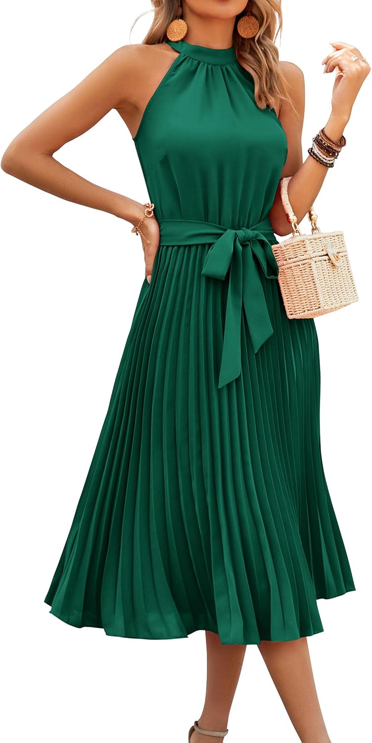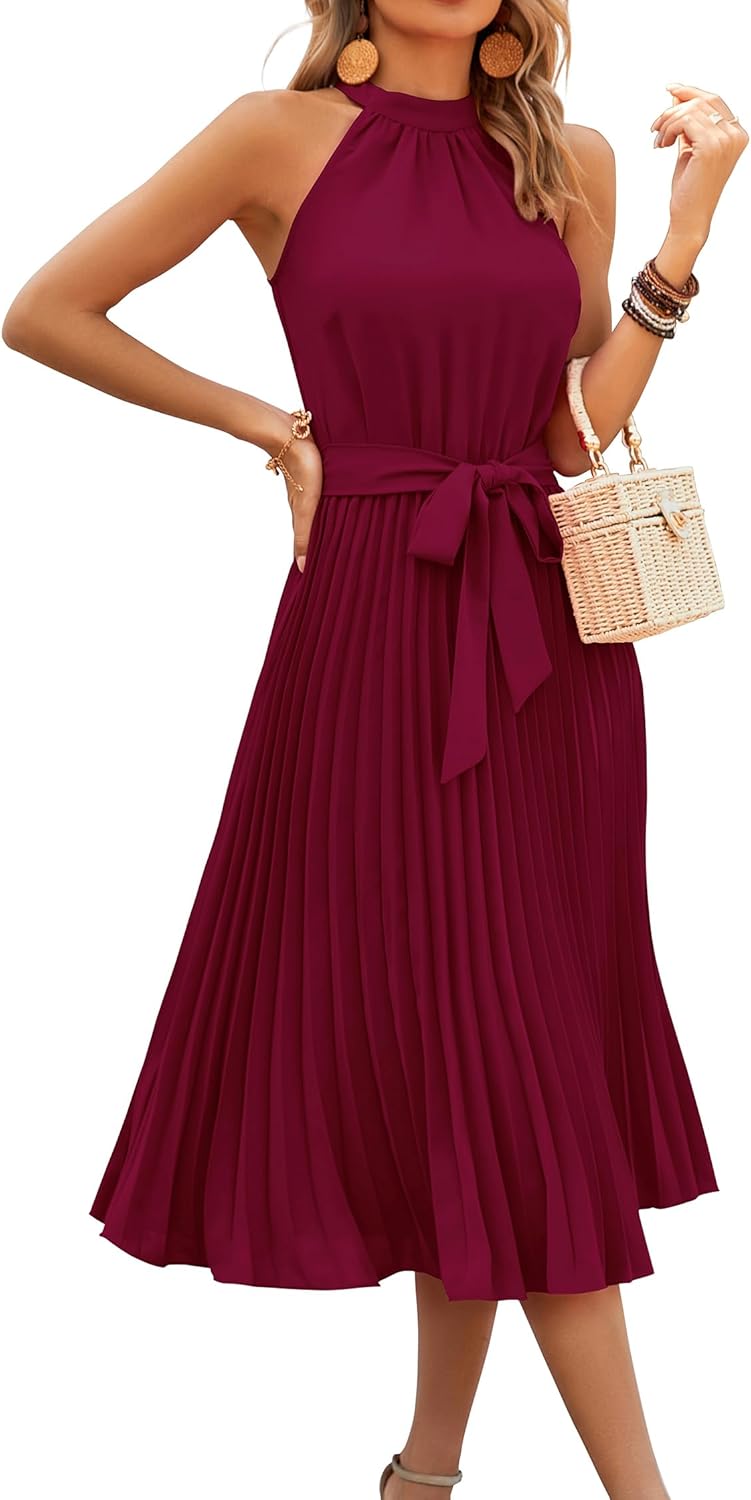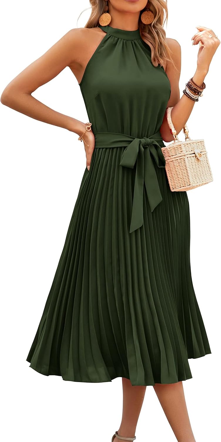 KIRUNDO Women’s 2025 Summer Sleeveless Halter Neck Pleated Midi Cocktail Dresses A Line Flowy Beach Sun Dress with Belt