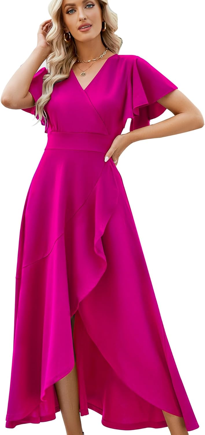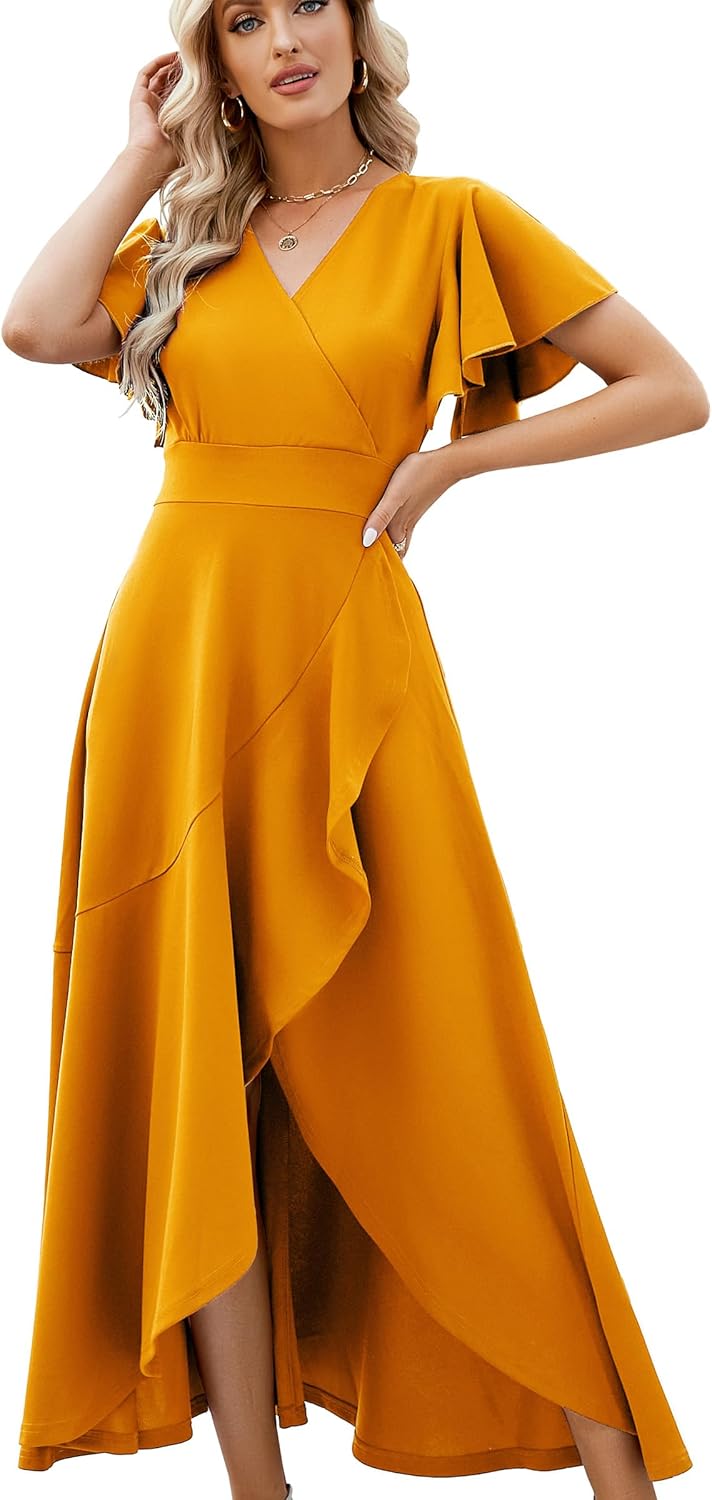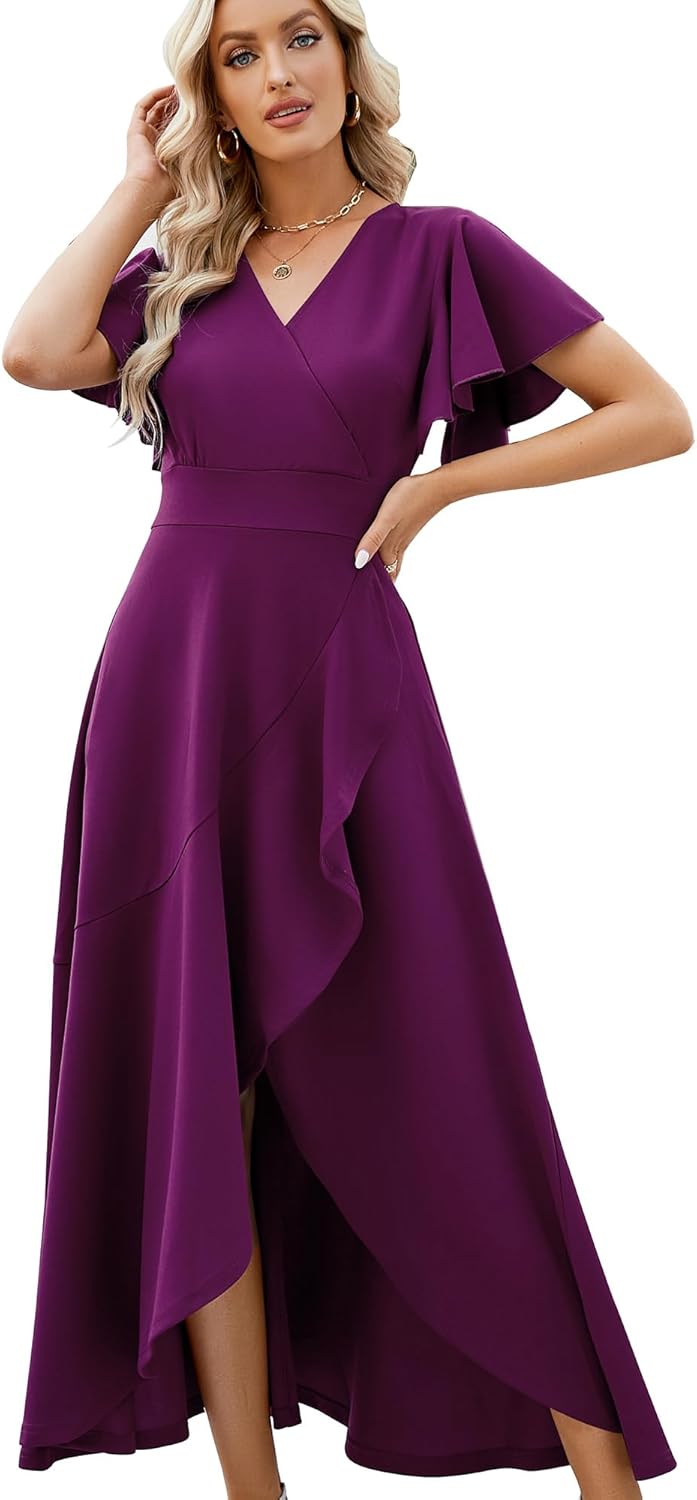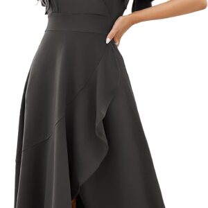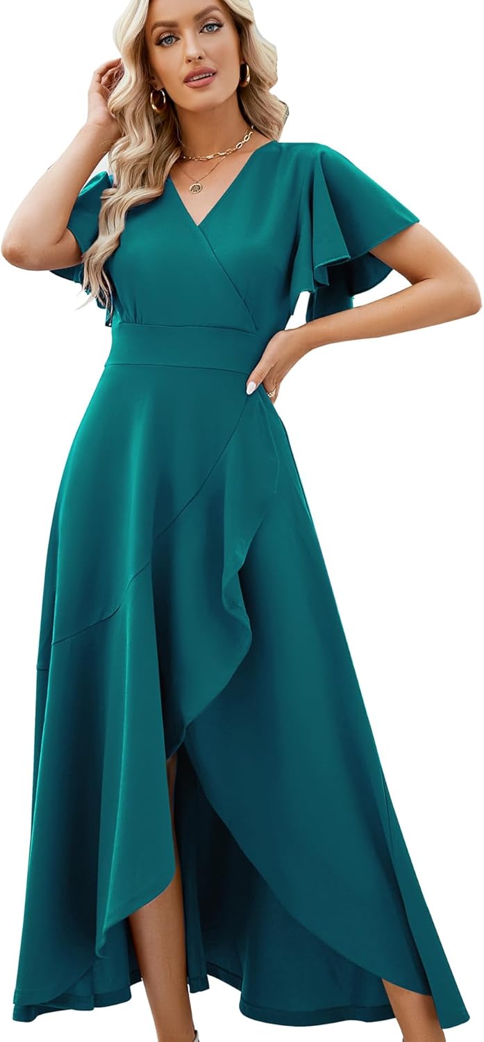 Long Black Formal Dresses for Women Gowns Evening Party Cocktail Dress,Split Elegant V Neck Wrap Ruffle Wedding Guest Dresses