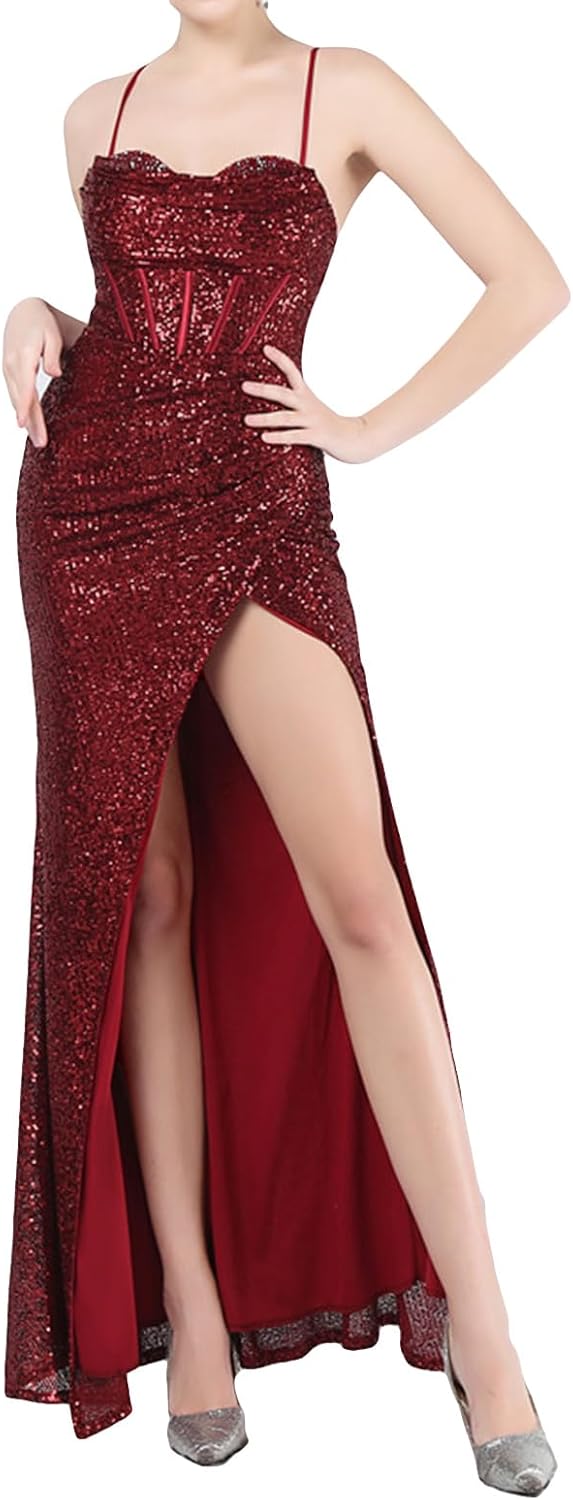 - Side split 1920s maxi sequin formal dress is so feminine and fresh with V neck, strap long Mermaid cocktail dress, back zipper floor length party dresses.