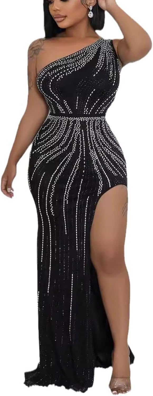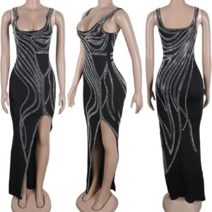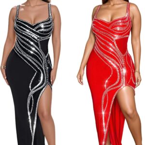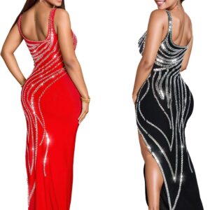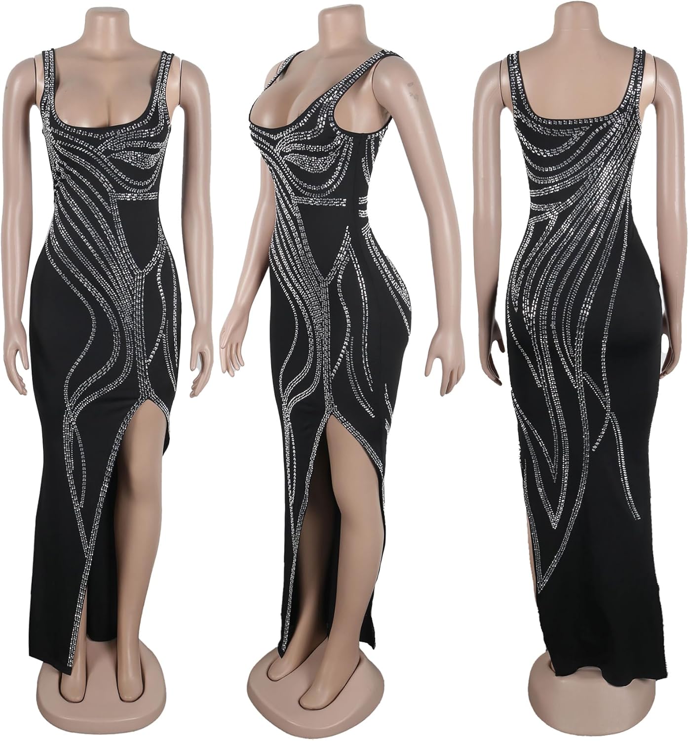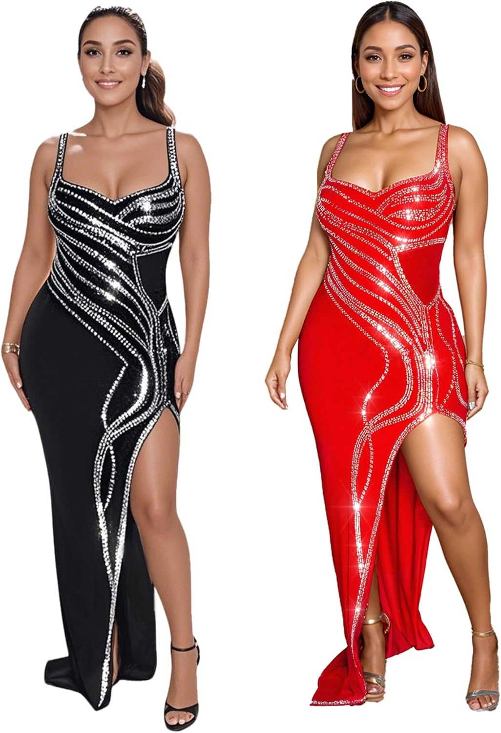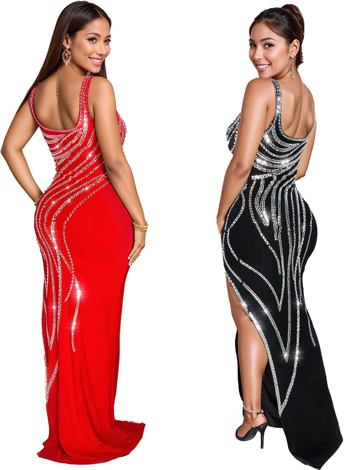 Sparkly Rhinestone Embellished Maxi Dress with Thigh Slit Long Evening Gown Dresses