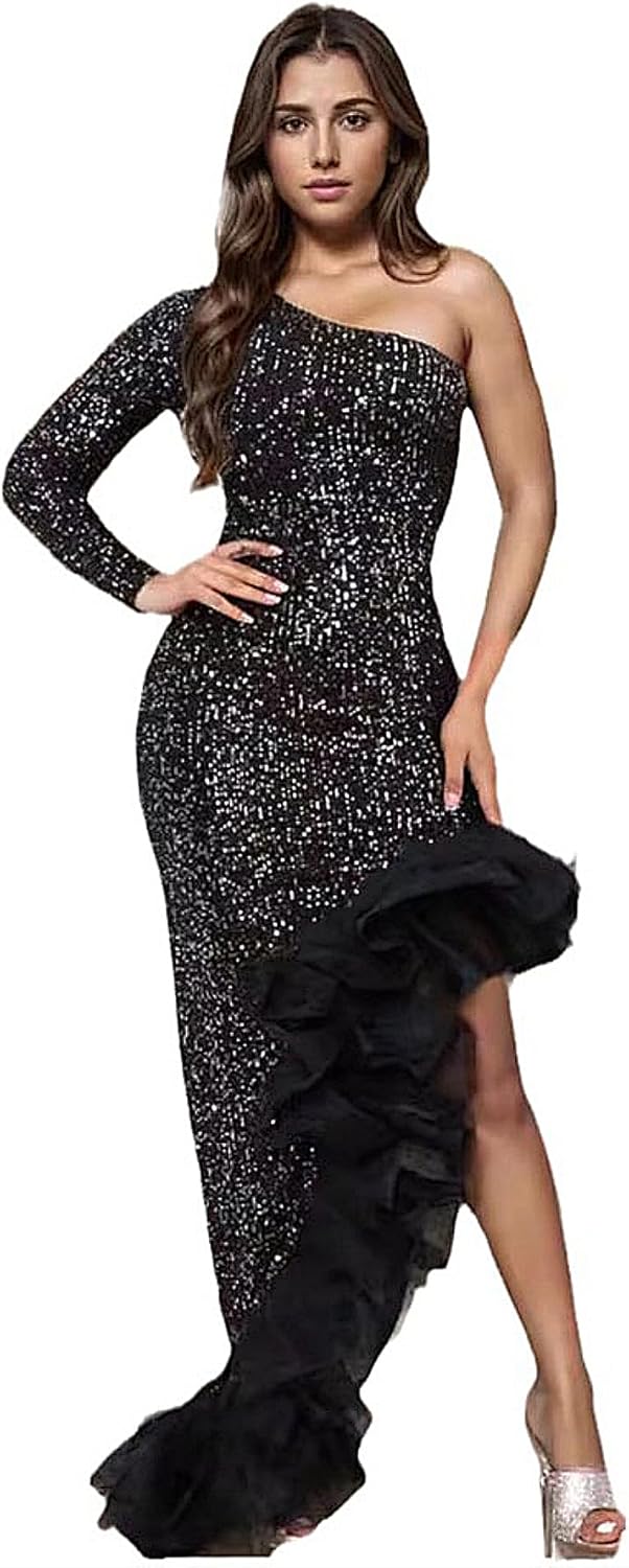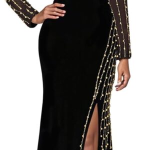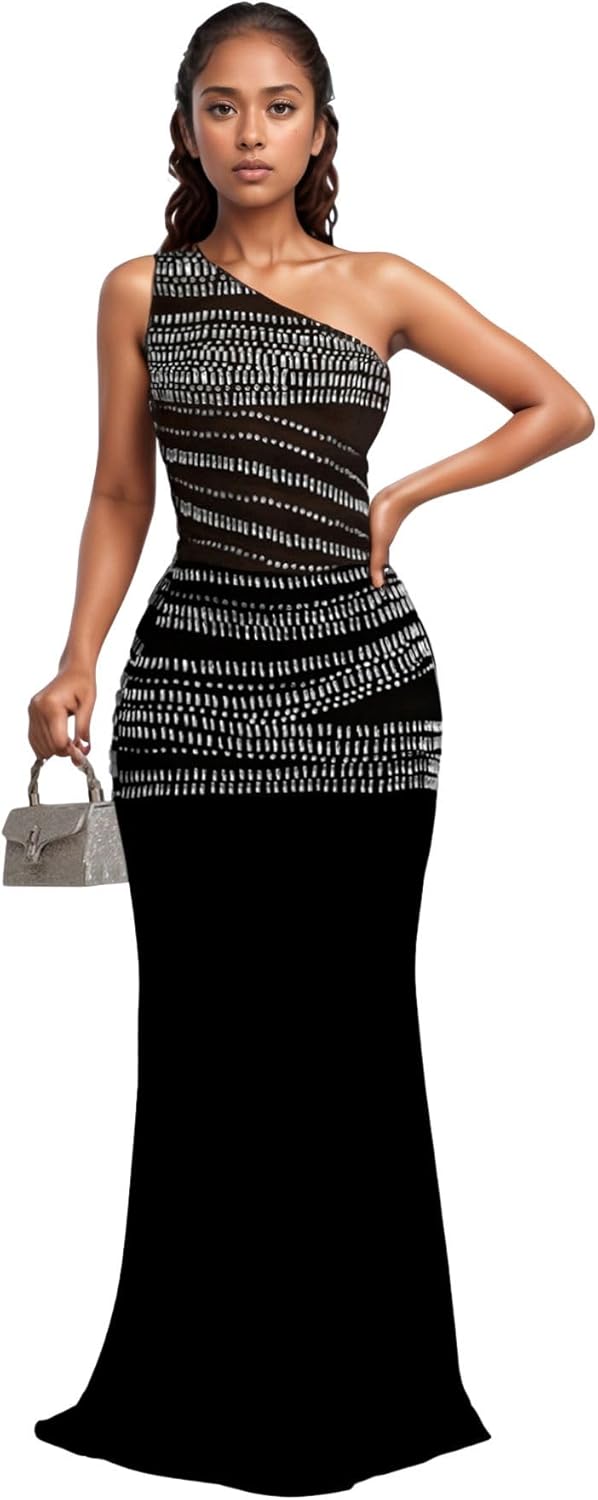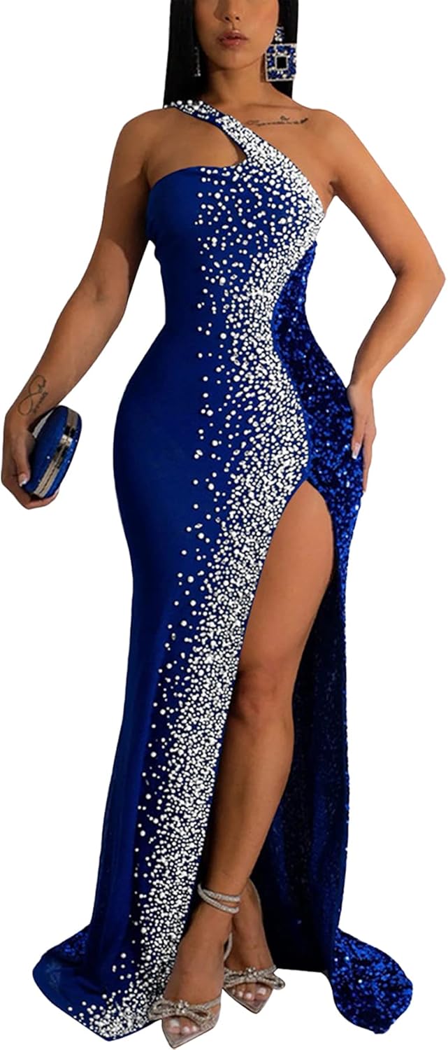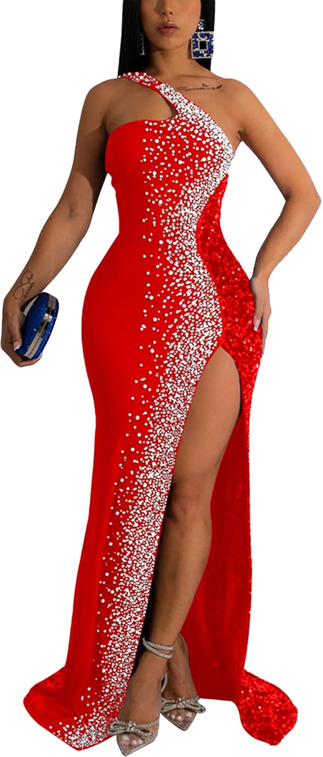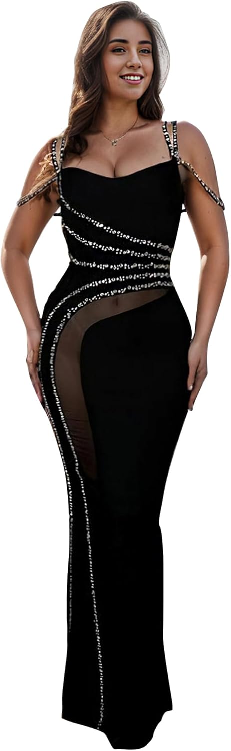 Sparkly Rhinestone Embellished Maxi Dress with Thigh Slit Long Evening Gown Dresses