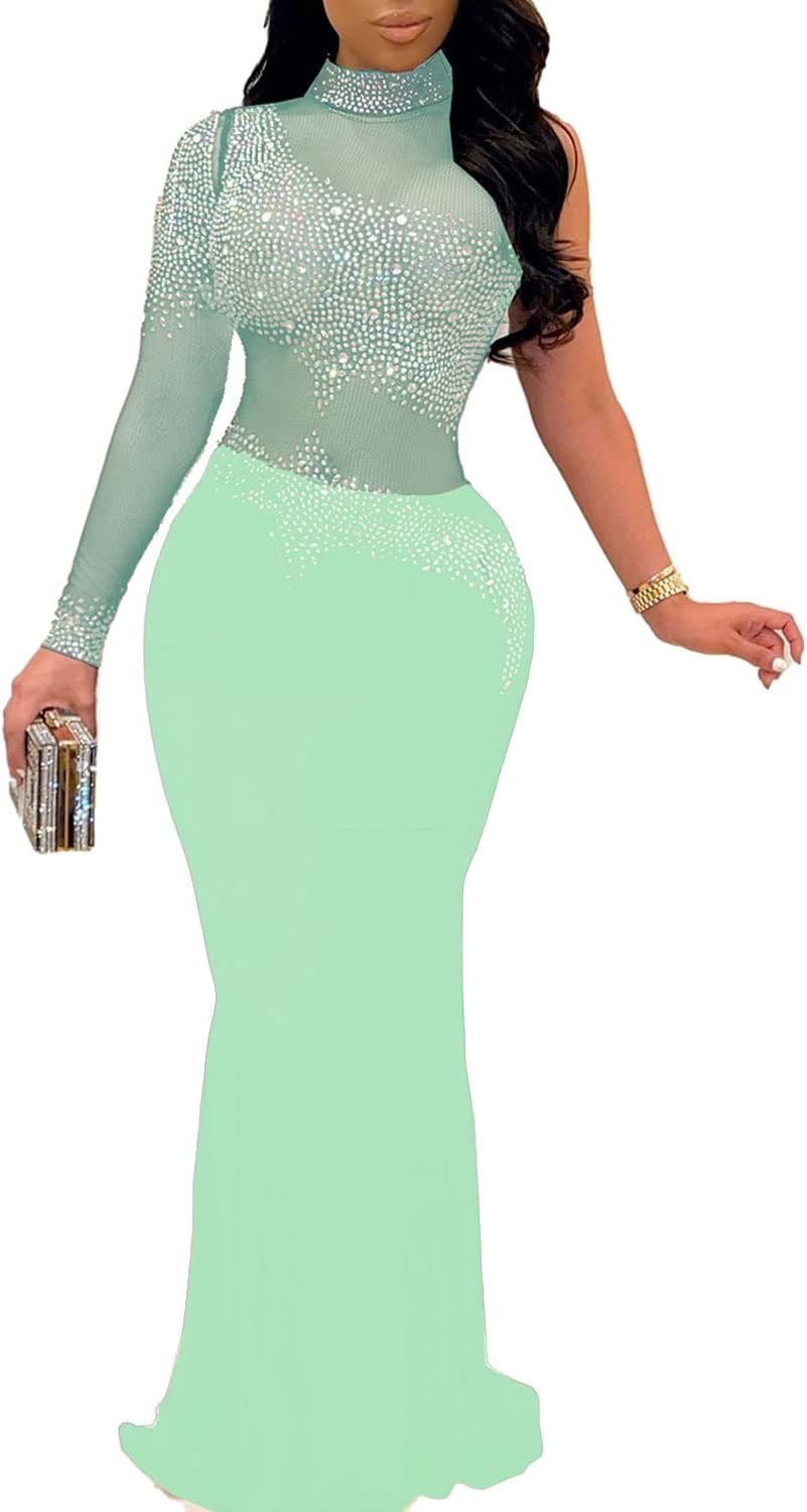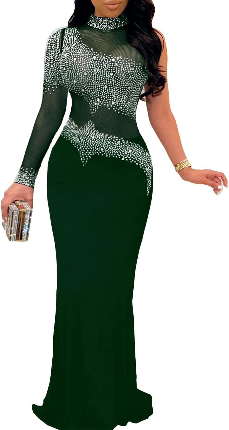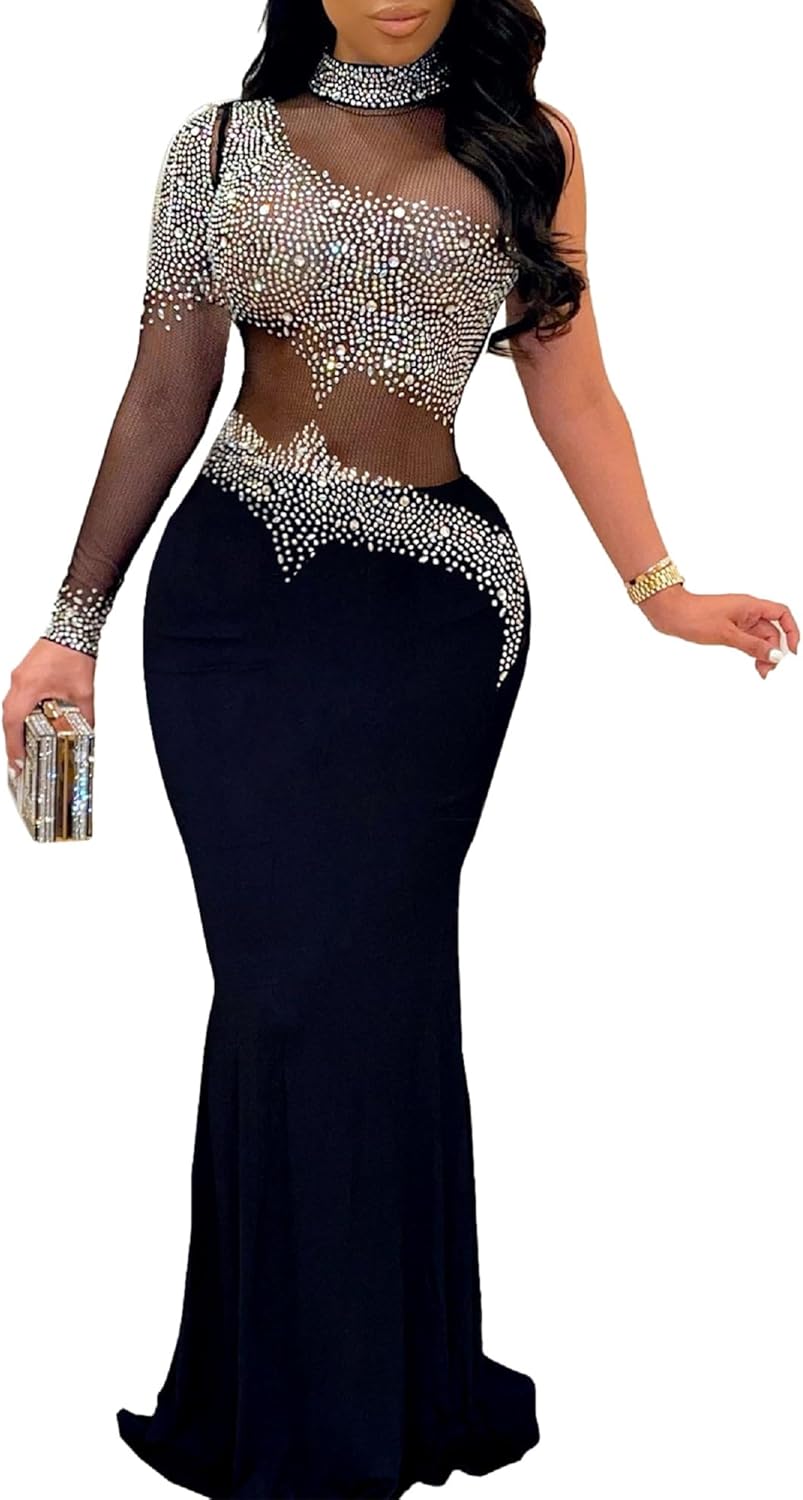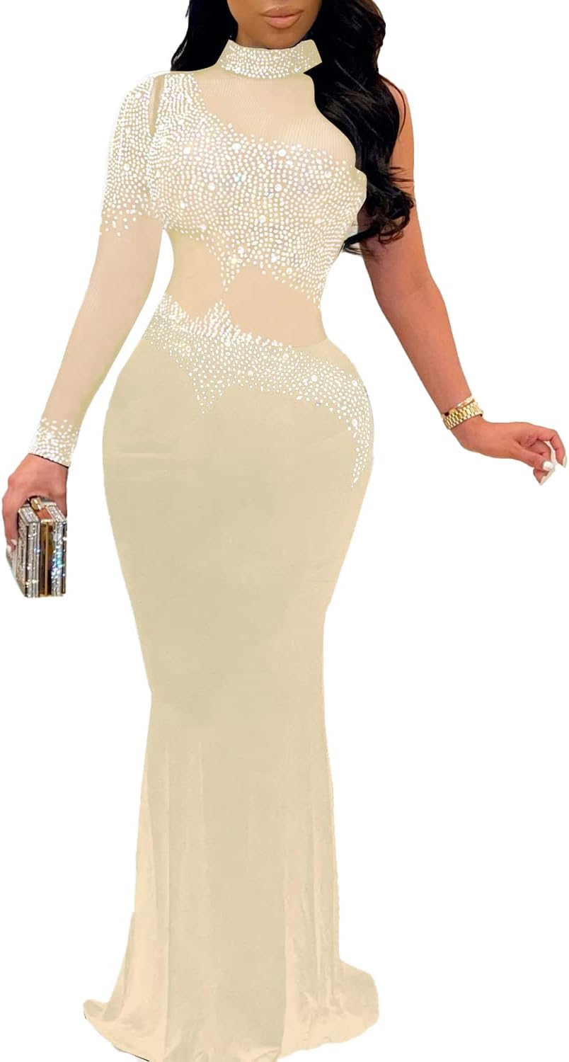 PORRCEY Women Sexy Hot Drilling Beaded Mesh See Through One Sleeve Party Club Night Dress