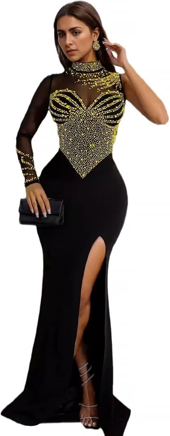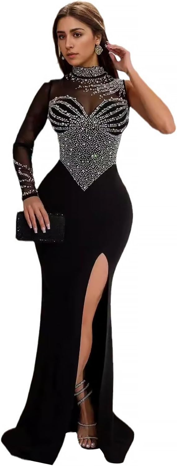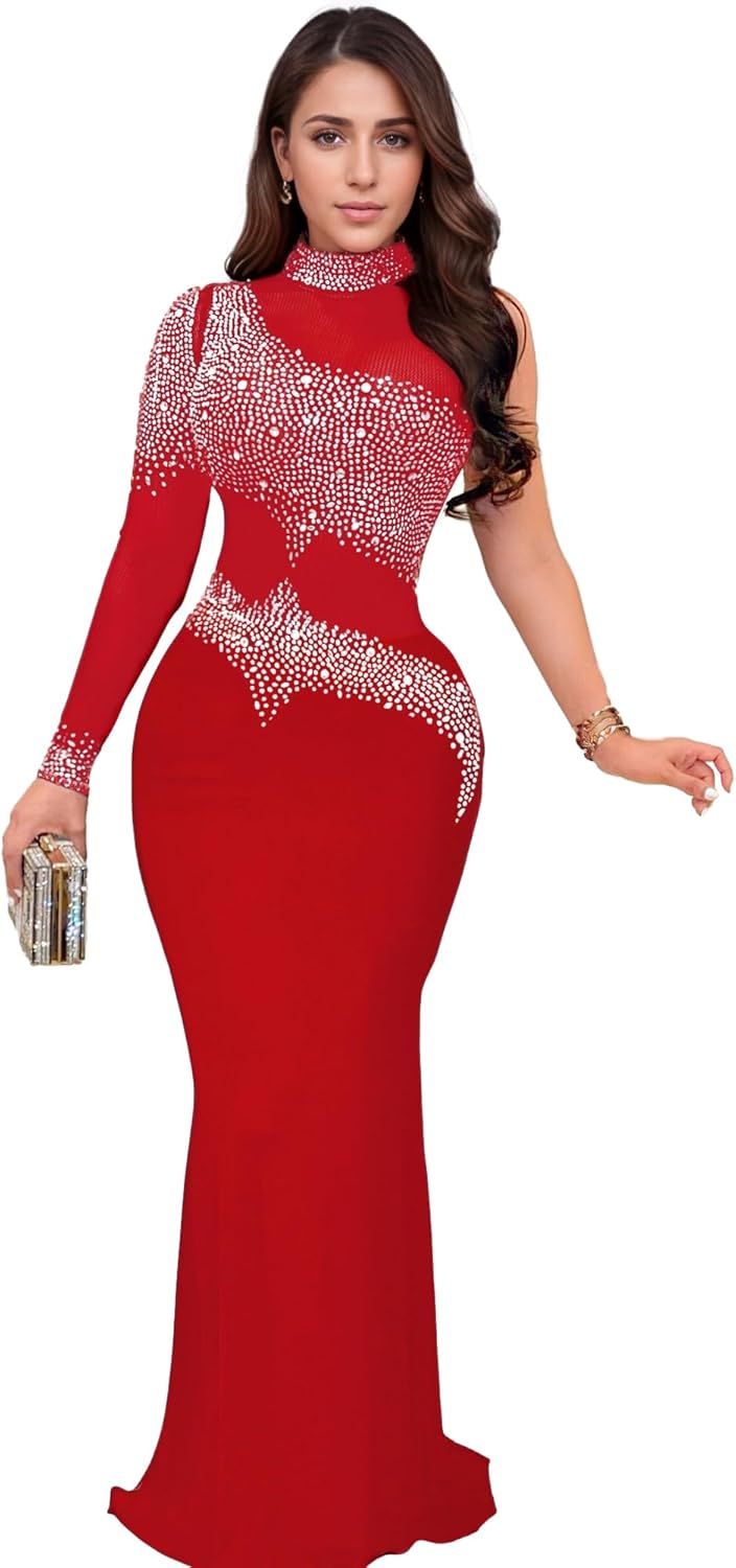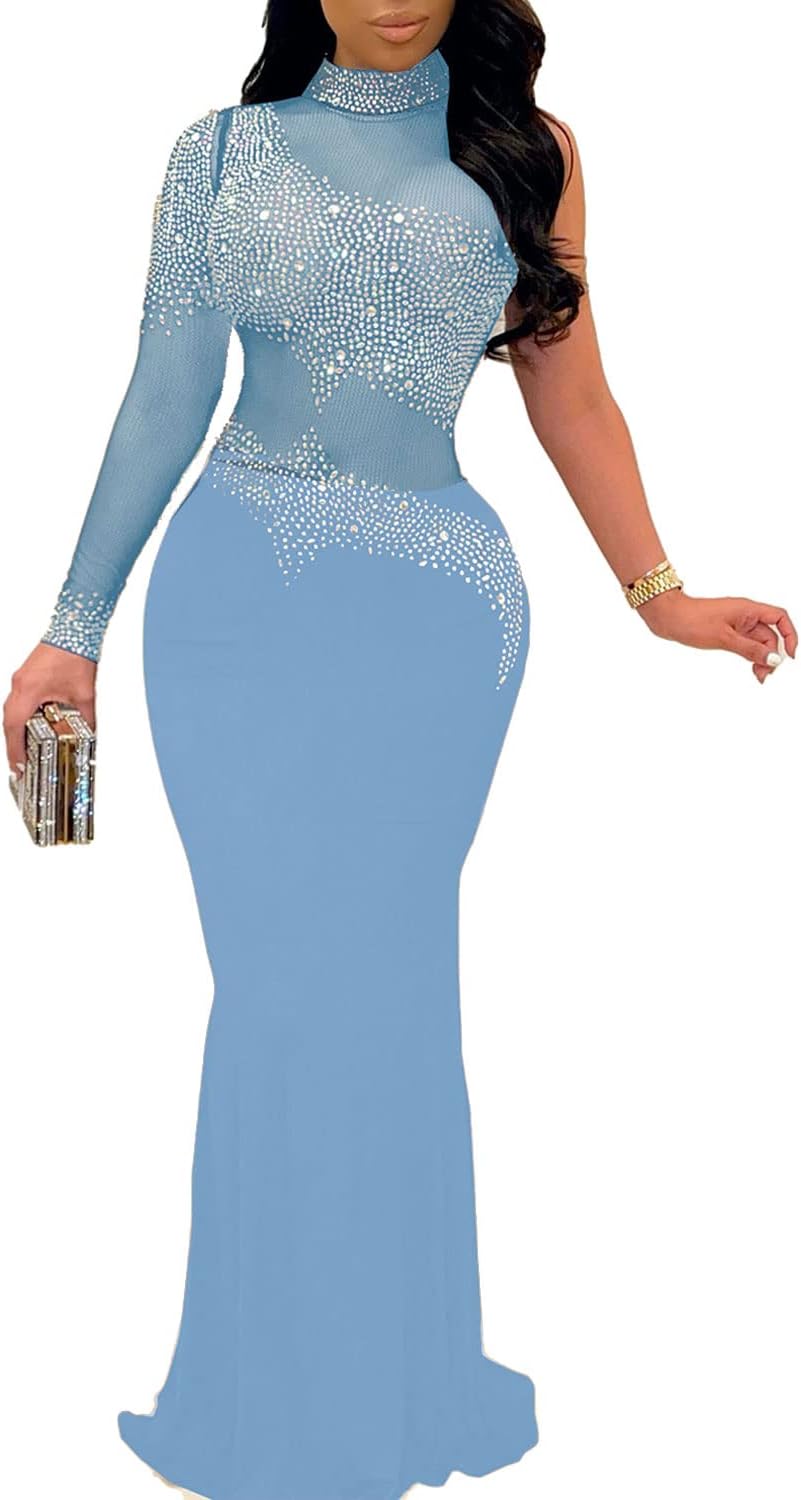 PORRCEY Women Sexy Hot Drilling Beaded Mesh See Through One Sleeve Party Club Night Dress