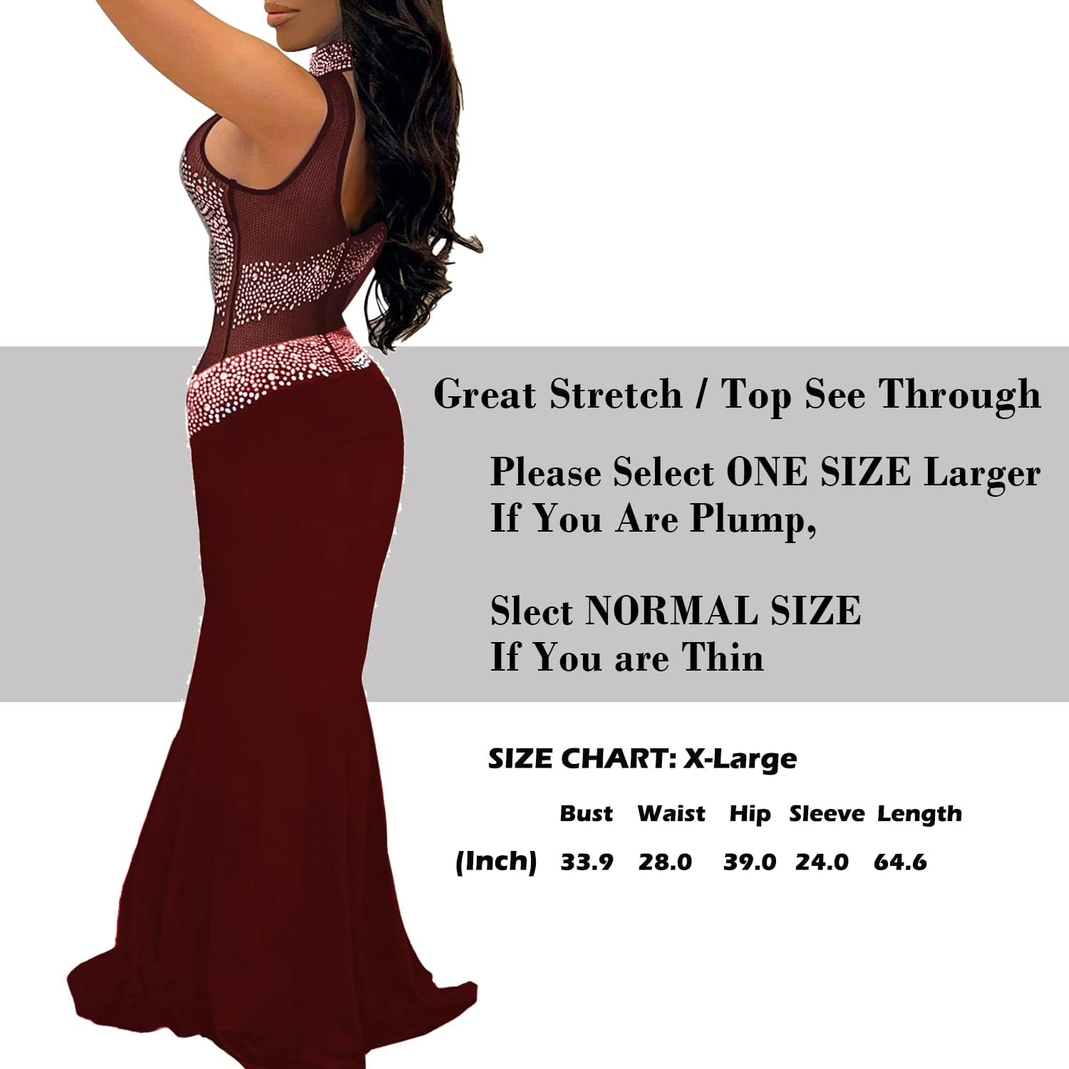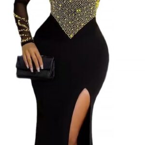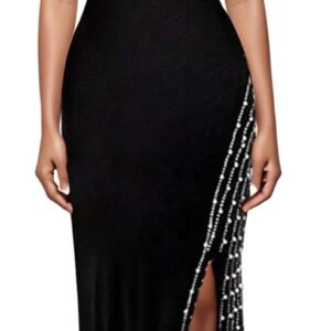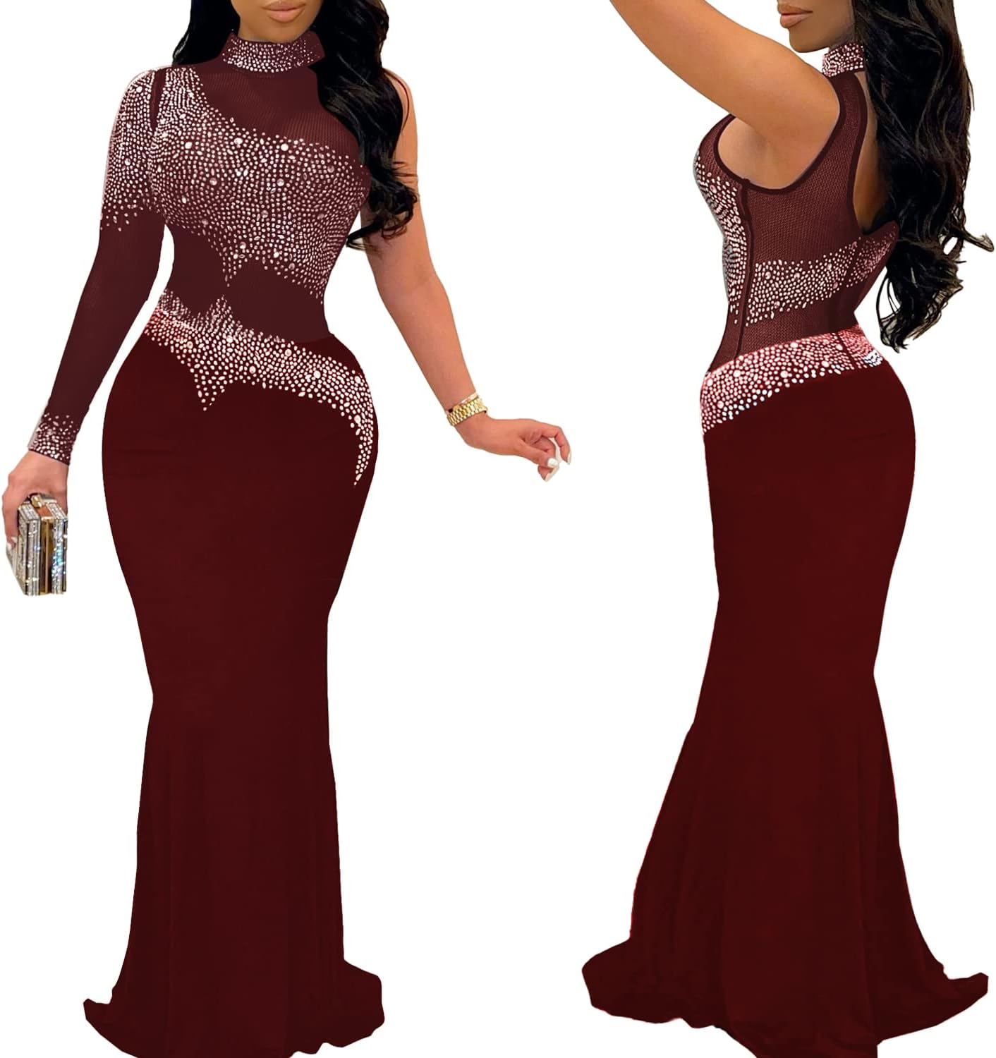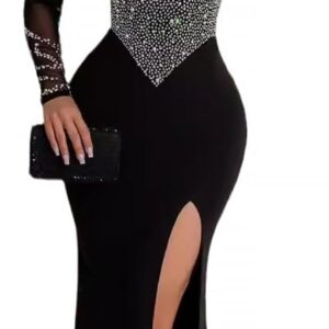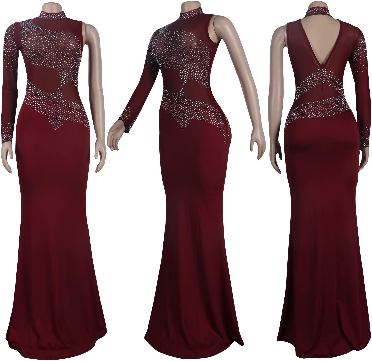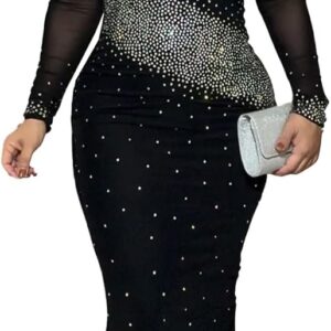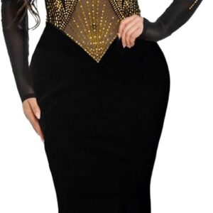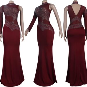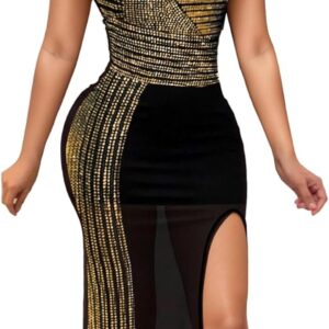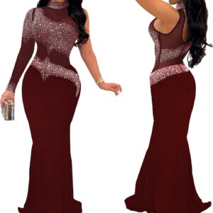 PORRCEY Women Sexy Hot Drilling Beaded Mesh See Through One Sleeve Party Club Night Dress