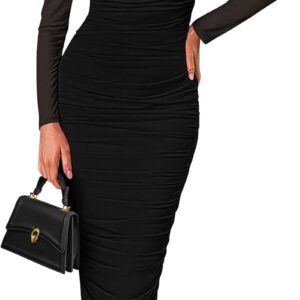 PRETTYGARDEN Fall Wedding Guest Dresses for Women 2025 Ruched Bodycon Midi Long Sleeve Formal Cocktail Dress