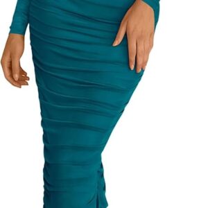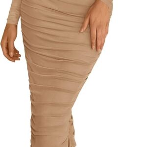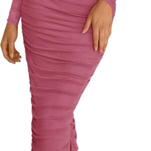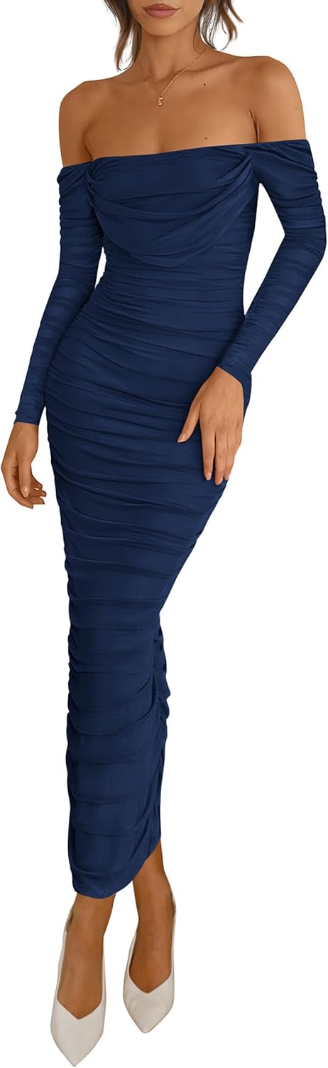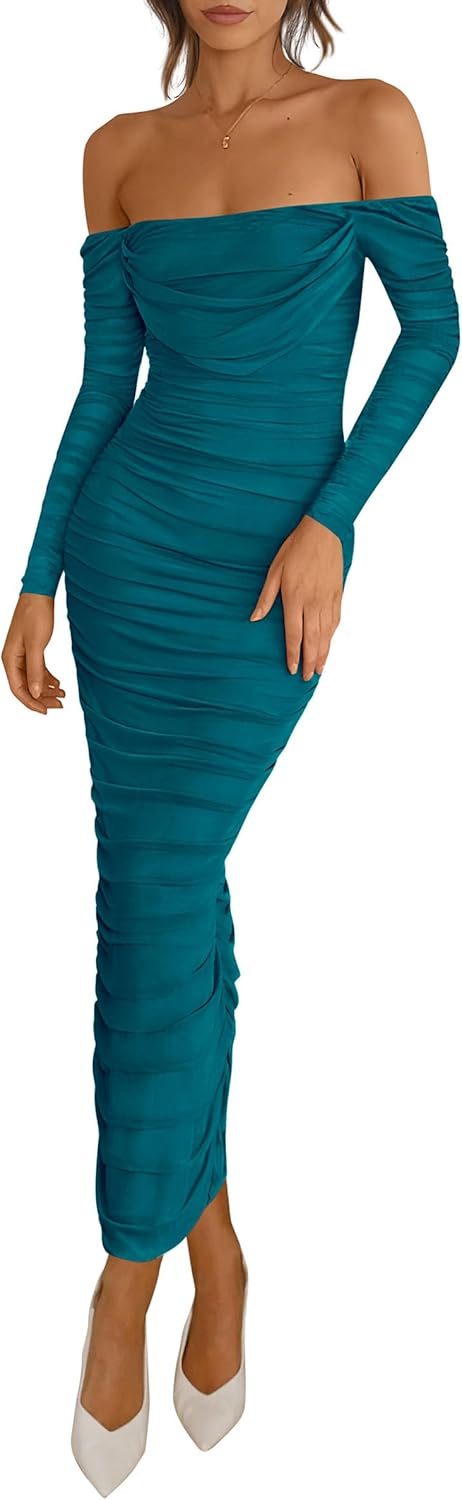 PRETTYGARDEN Womens 2025 Fall Long Sleeve Maxi Dress Off Shoulder Mesh Ruched Bodycon Trendy Long Wedding Guest Dresses