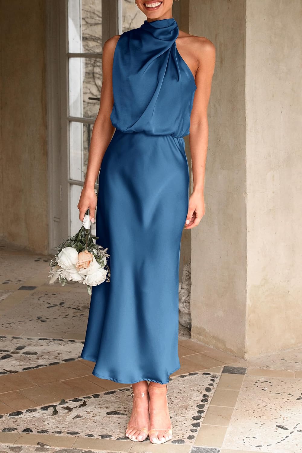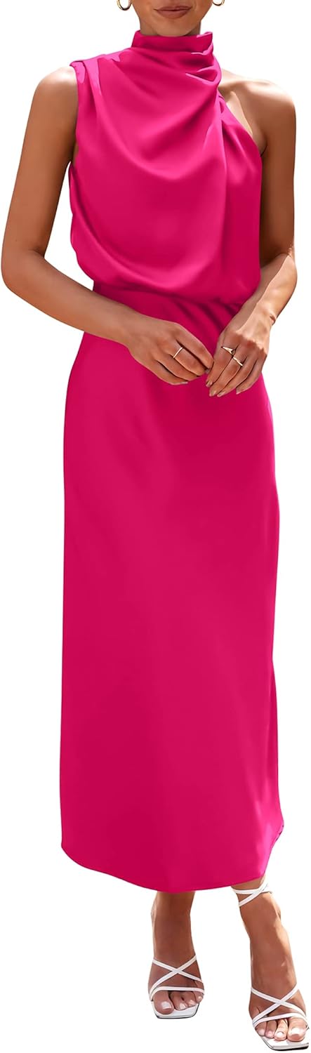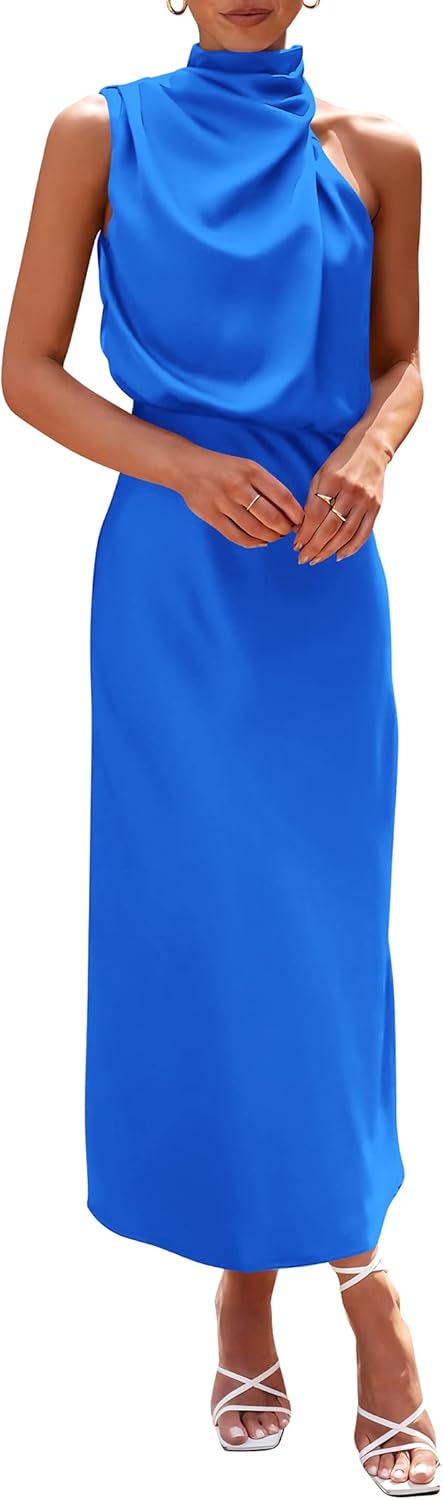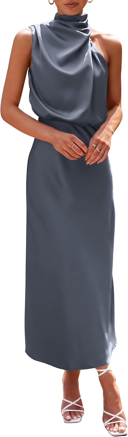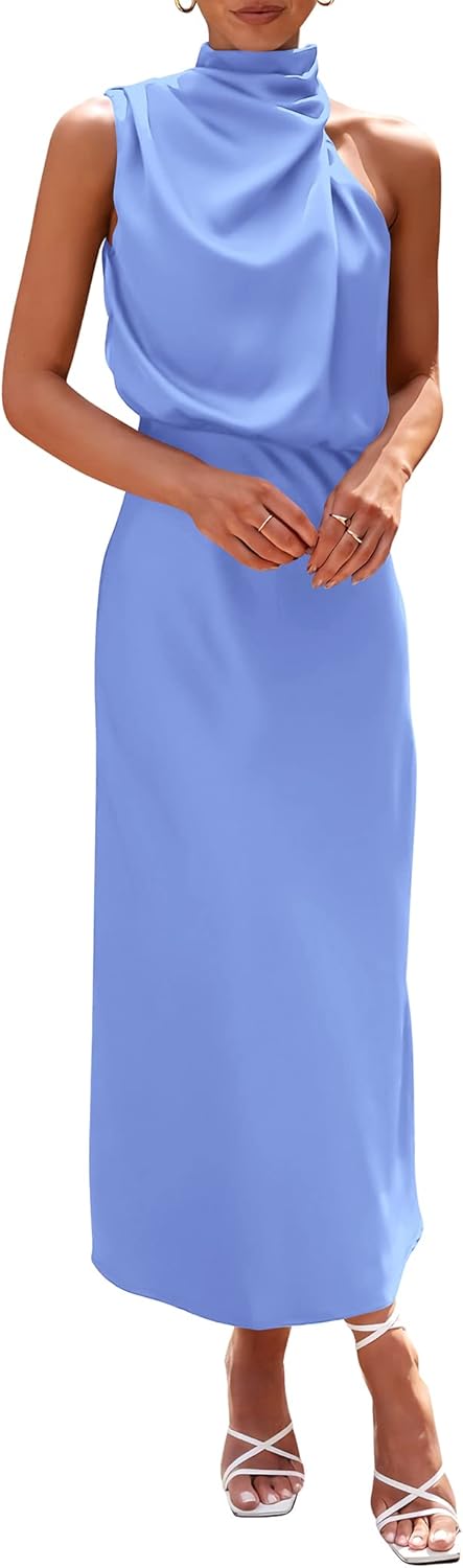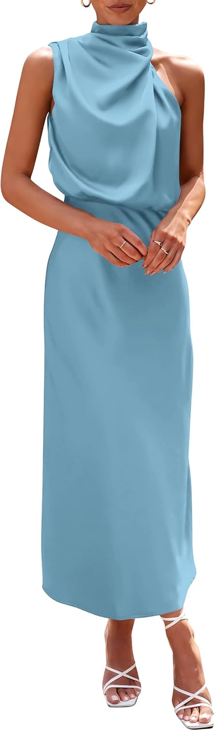 PRETTYGARDEN Women’s 2025 Summer Satin Dress Elegant Sleeveless Mock Neck Cocktail Party Maxi Dresses