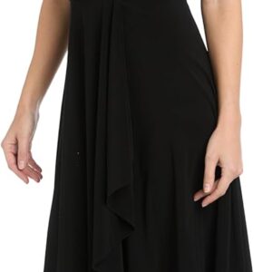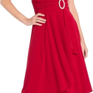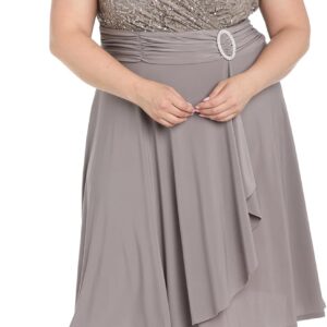 Make an unforgettable entrance in this beautiful knee length wrap dress, where elegance meets comfort. This stunning piece features a soft stretch lace bodice with glimmering sequins that add just the right amount of sparkle. The faux wrap design flatters effortlessly, while the cascading skirt creates beautiful movement with every step. A rhinestone-embellished oval buckle highlights the waist for a polished and radiant finish. Complete with short sleeves and a flexible fit, this dress is your go-to choice for weddings, cocktail parties and any evening event where you want to shine.