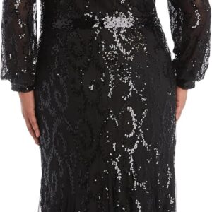 - Features: Long sequined Blouson silhouette dress W/ V Front, Long Sleeves, all over sequins, power mesh insets, hidden zipper closure.