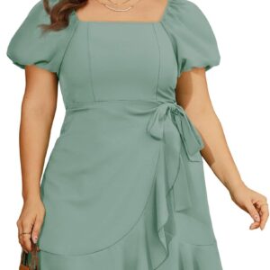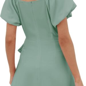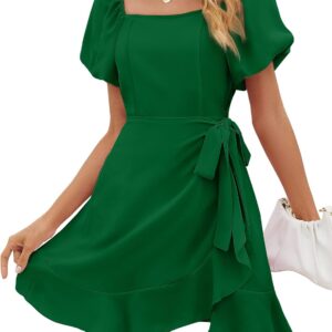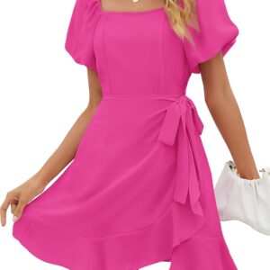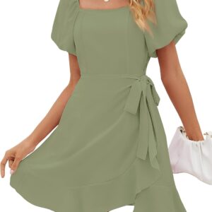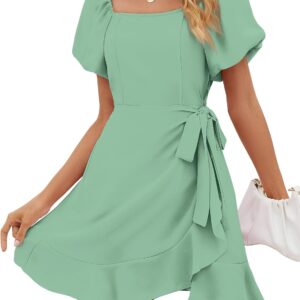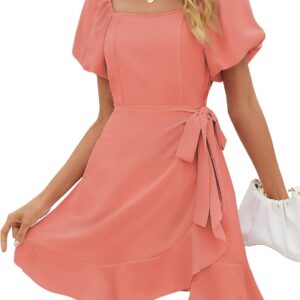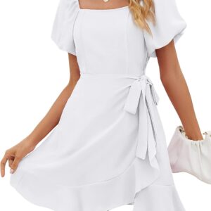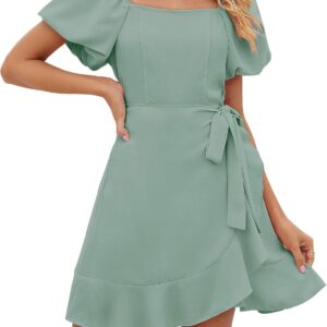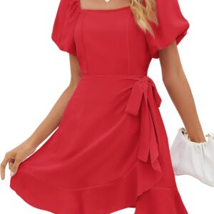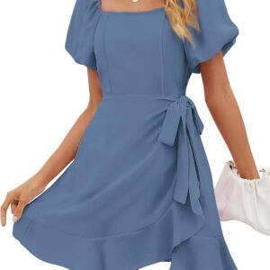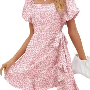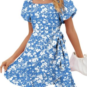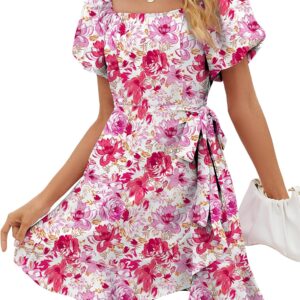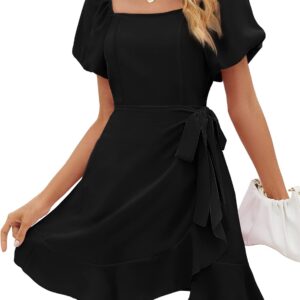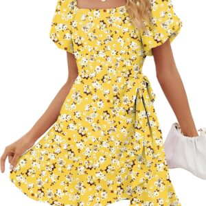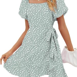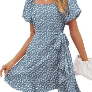 SAMPEEL Womens Summer Dresses Square Neck Puff Sleeve Tie Waist Short Dress