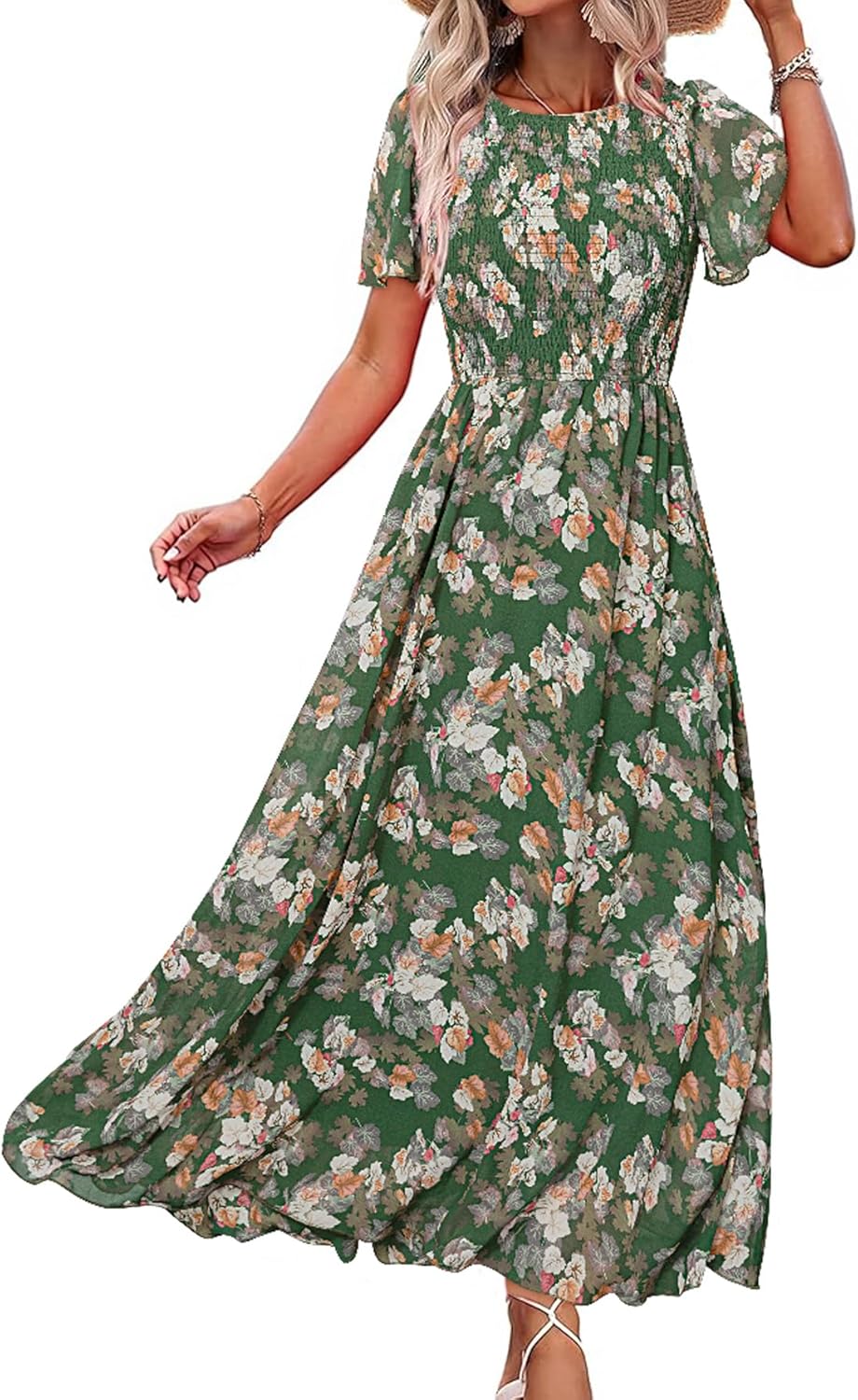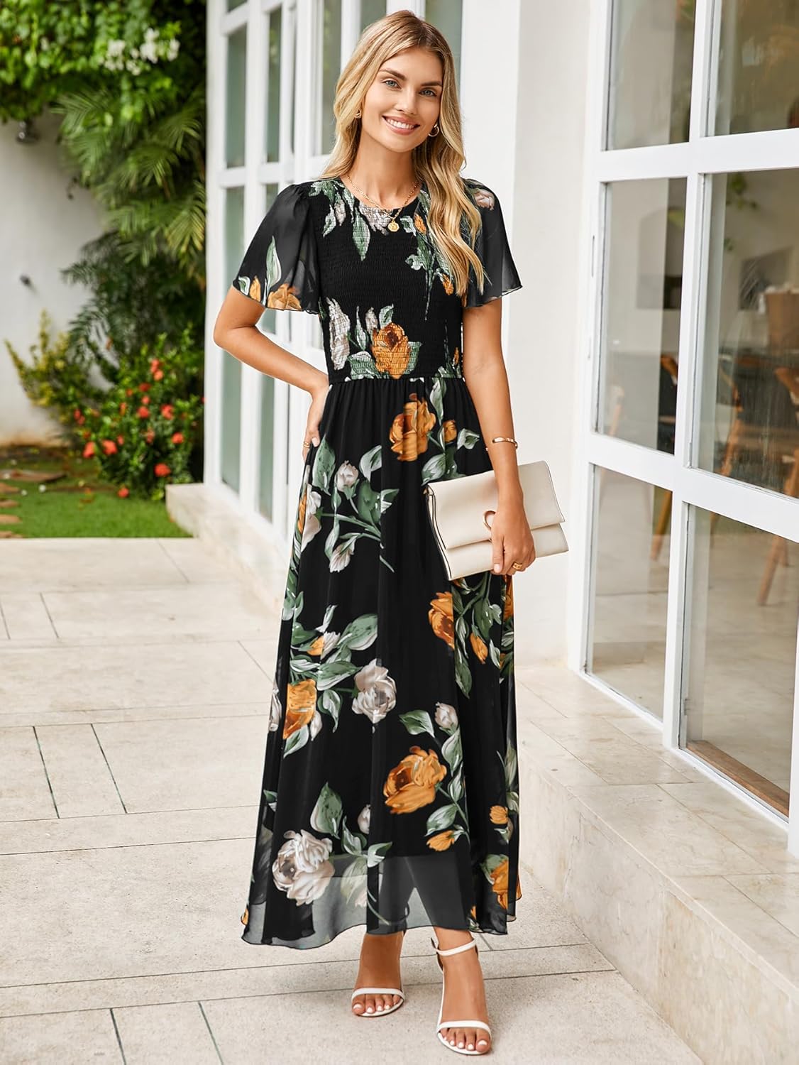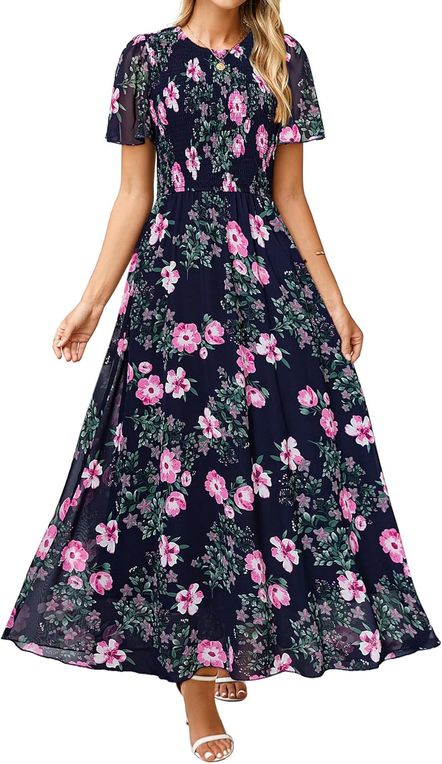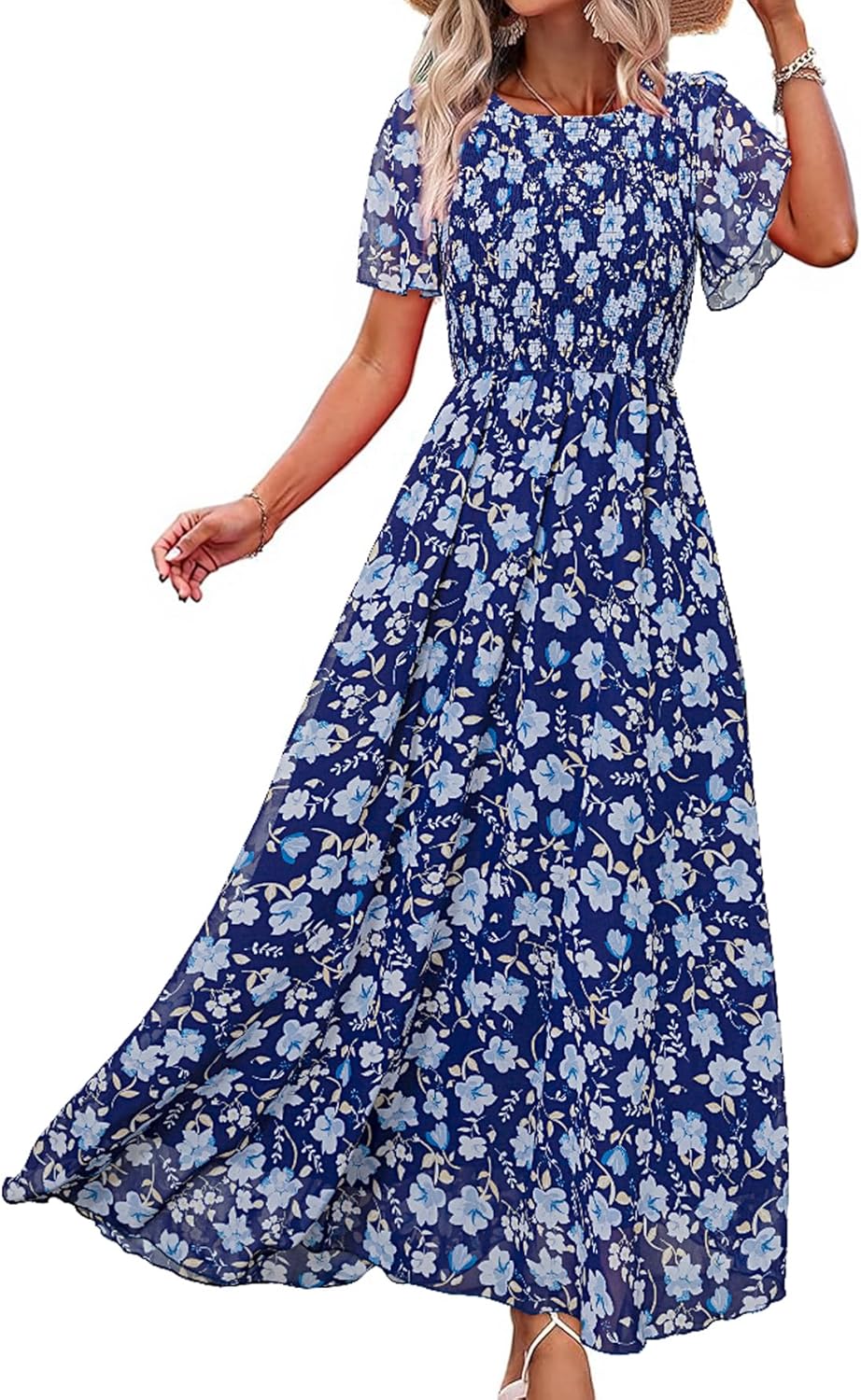 Simplee Womens Summer Floral Casual Maxi Dresses Flutter Short Sleeve Crew Neck Smocked Chiffon Boho Flowy Dress