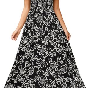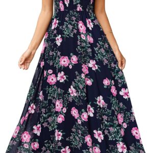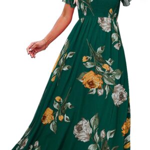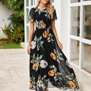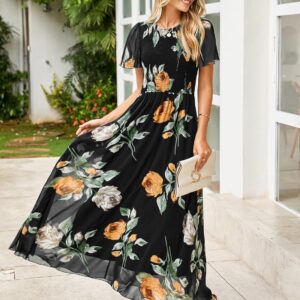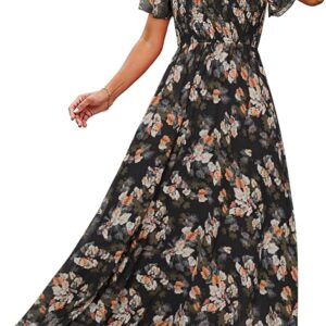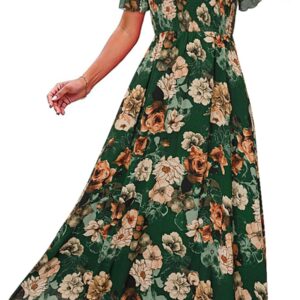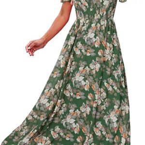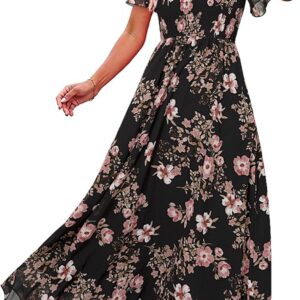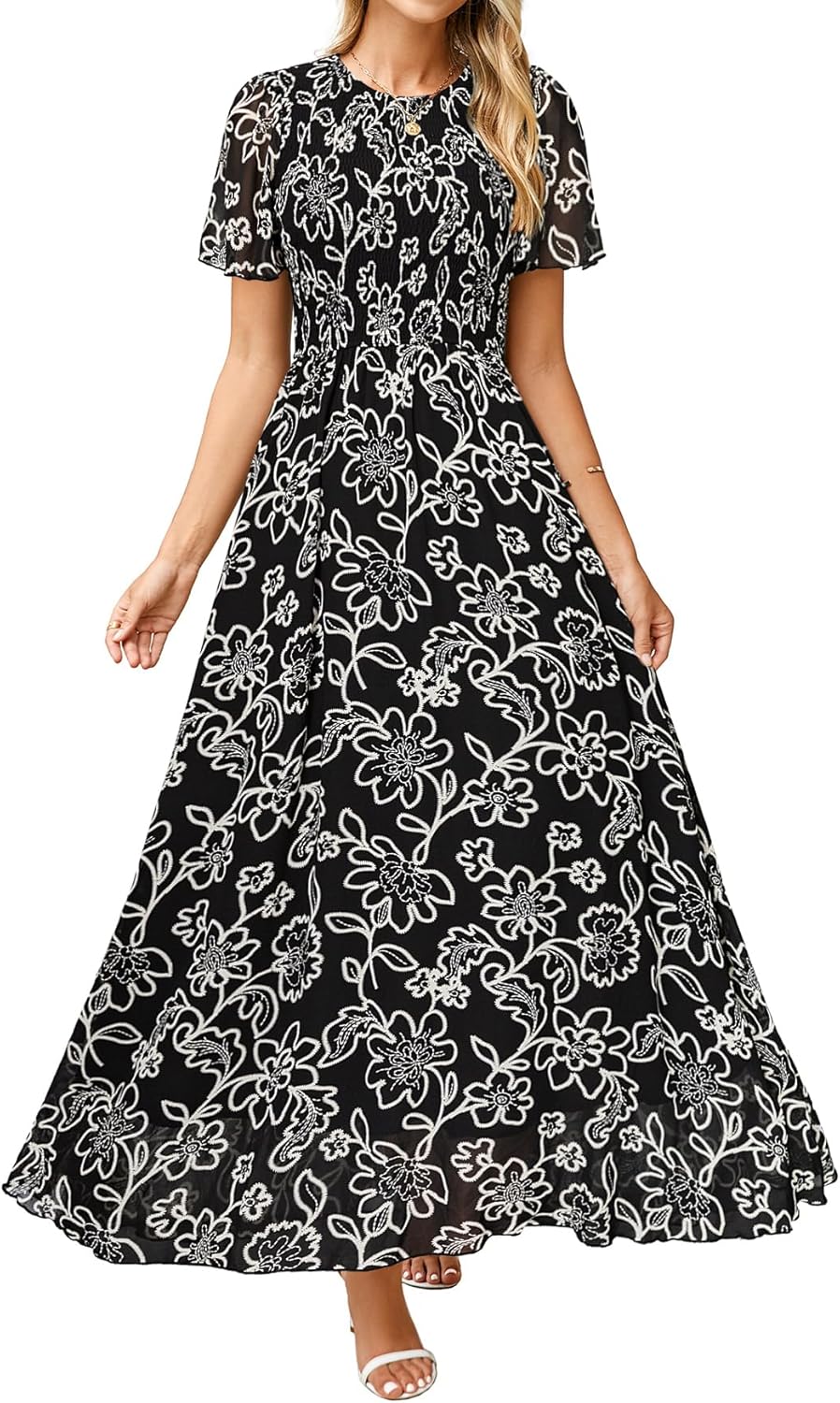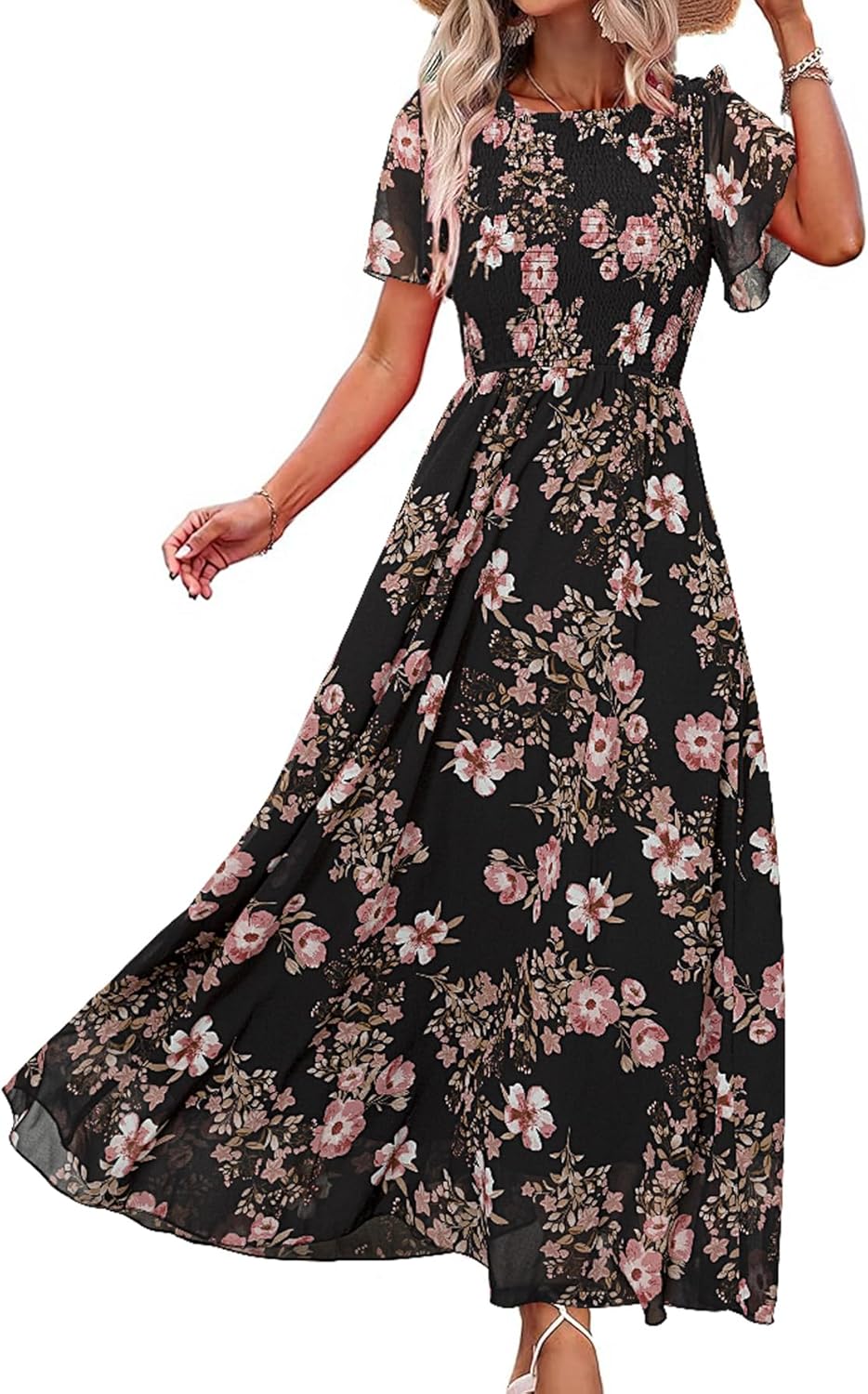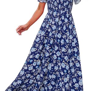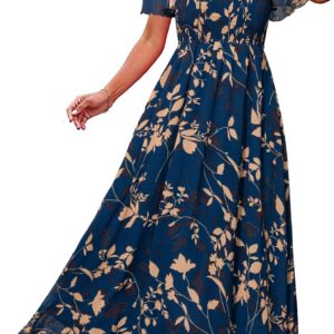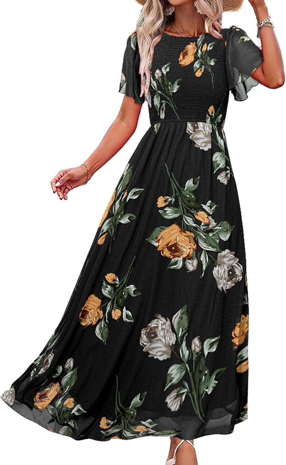 Simplee Womens Summer Floral Casual Maxi Dresses Flutter Short Sleeve Crew Neck Smocked Chiffon Boho Flowy Dress