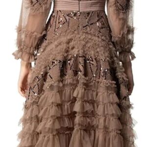 Women’s Autumn and Winter Ball Gown Dress Stand Collar Lantern Sleeved Sequins Ruffles Slim Evening Dresses