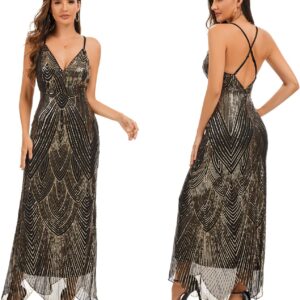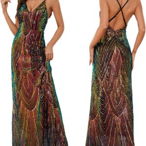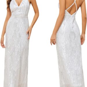 Women’s V Neck Spaghetti Straps Sequin Sparkly Glitter Irregular Hem Prom Dress Bcakless Maxi Evening Gowns